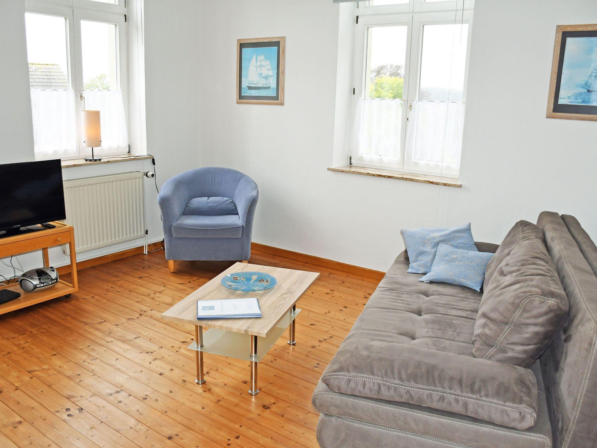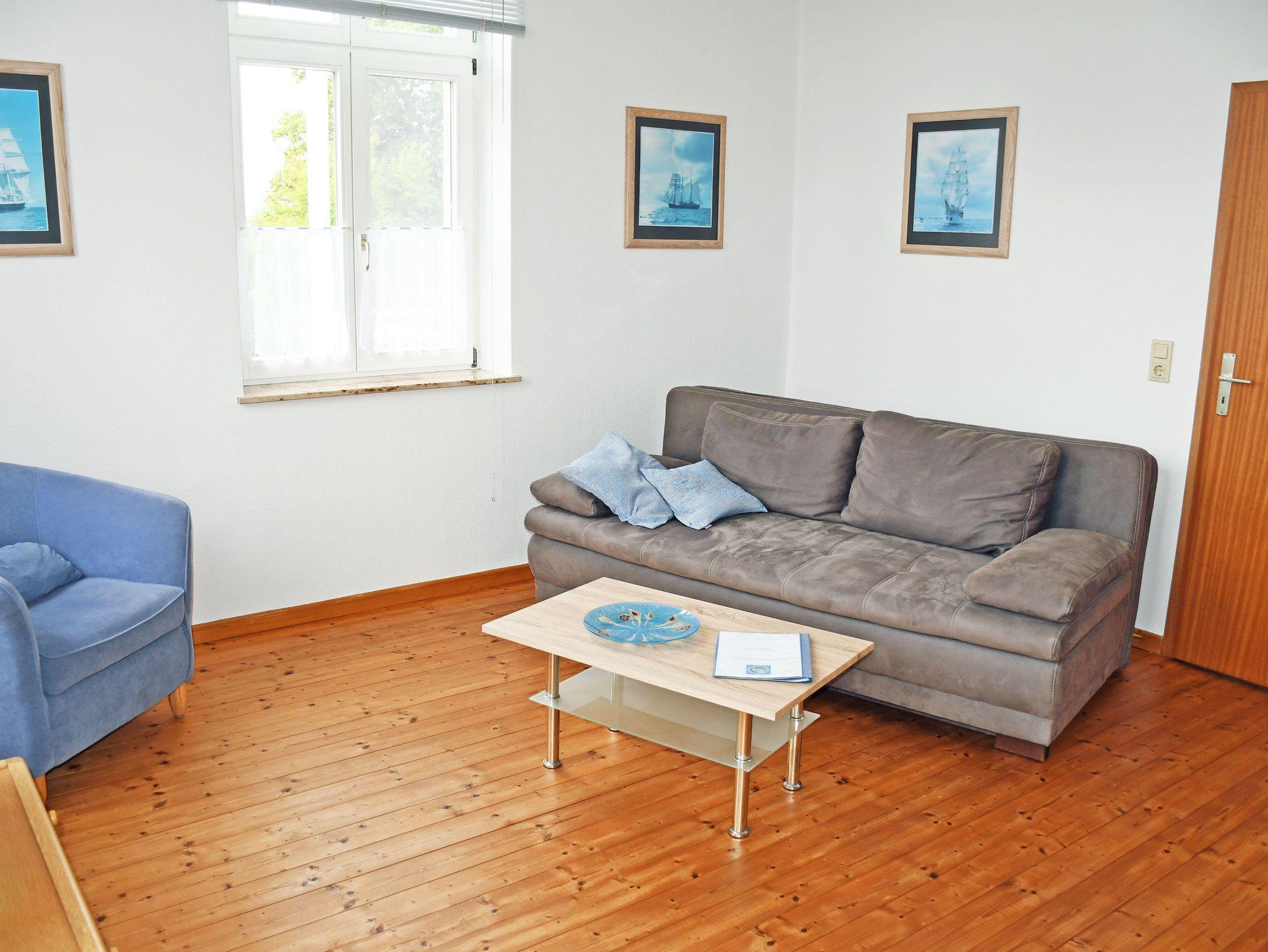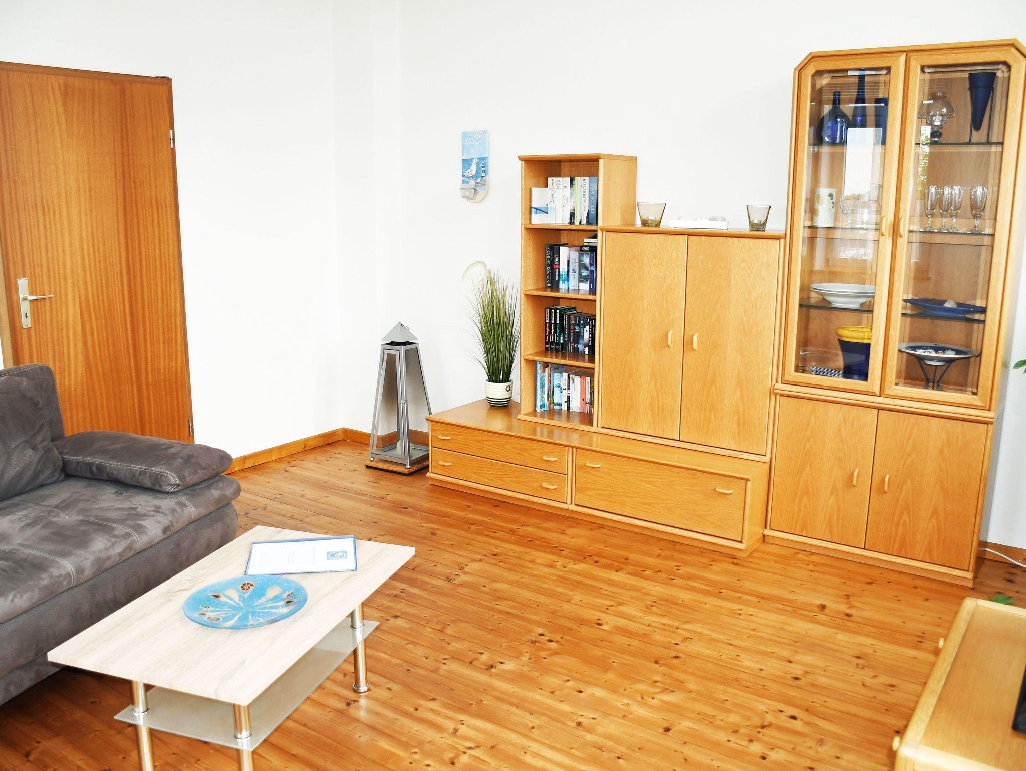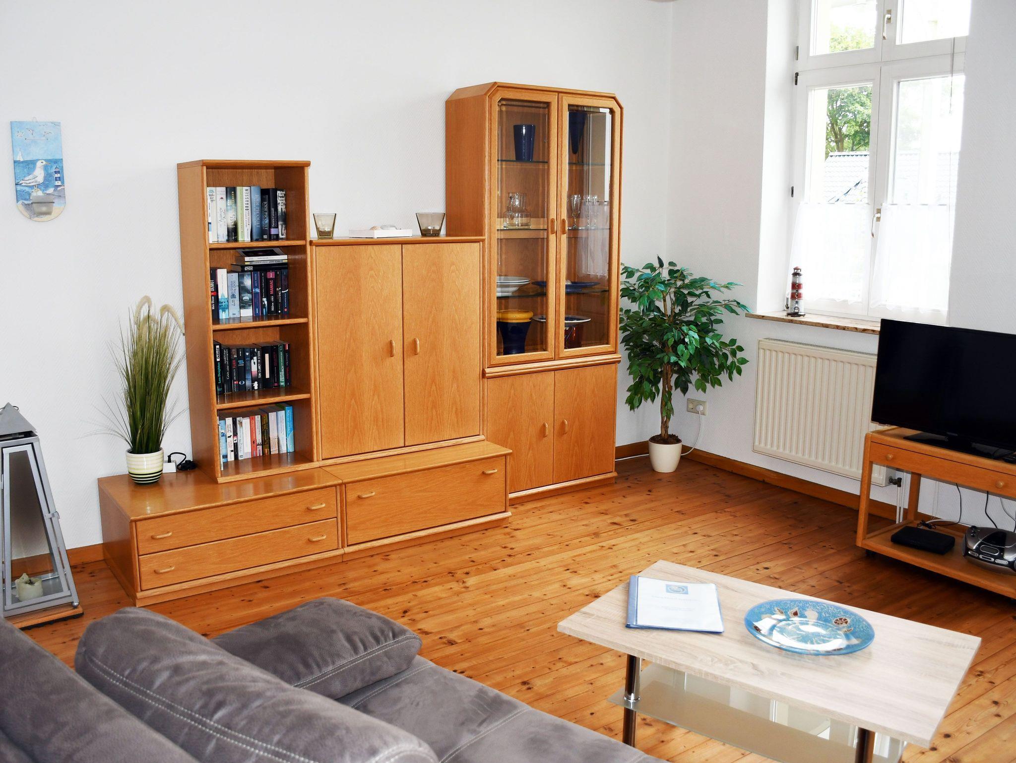 1 Wohnzimmer mit einer Aufbettungscouch, 1 Couchtisch, 1 Sessel, Kommode mit Flat-TV, eine Wohnwand, CD-Radio, Gesellschaftsspiele