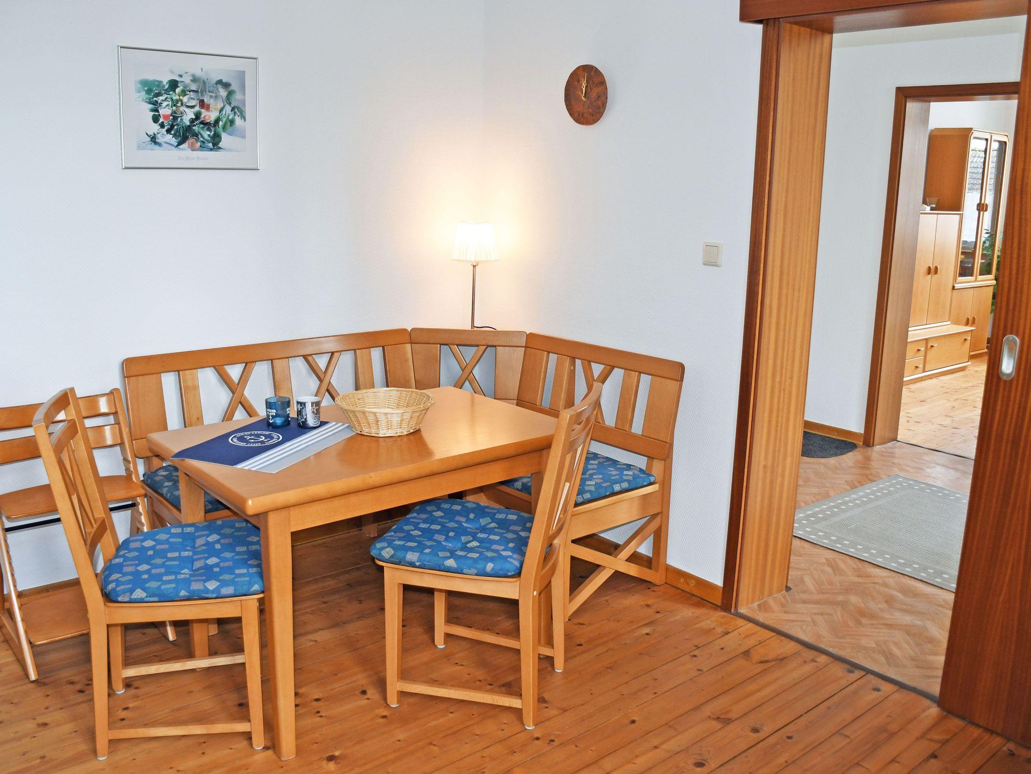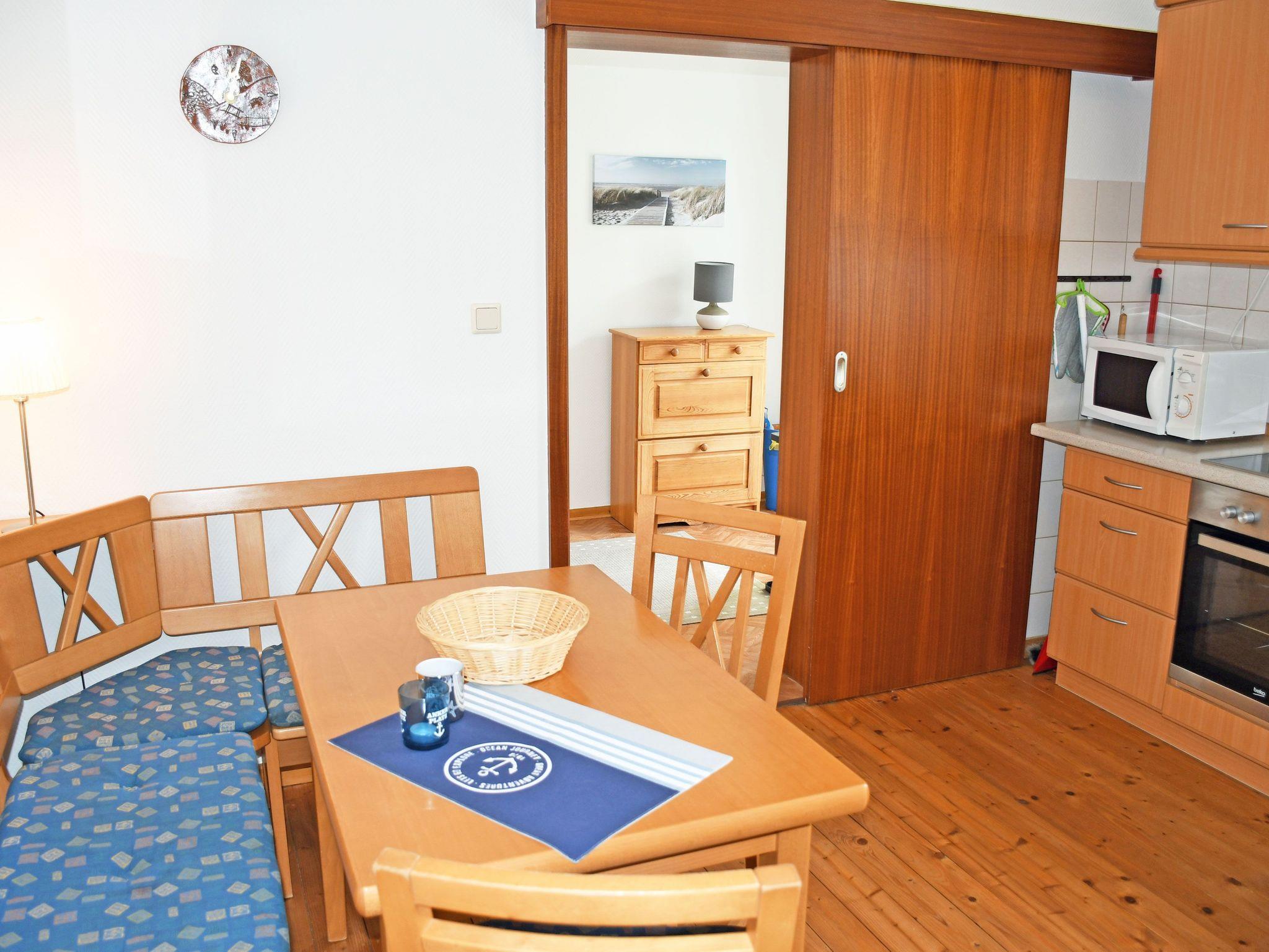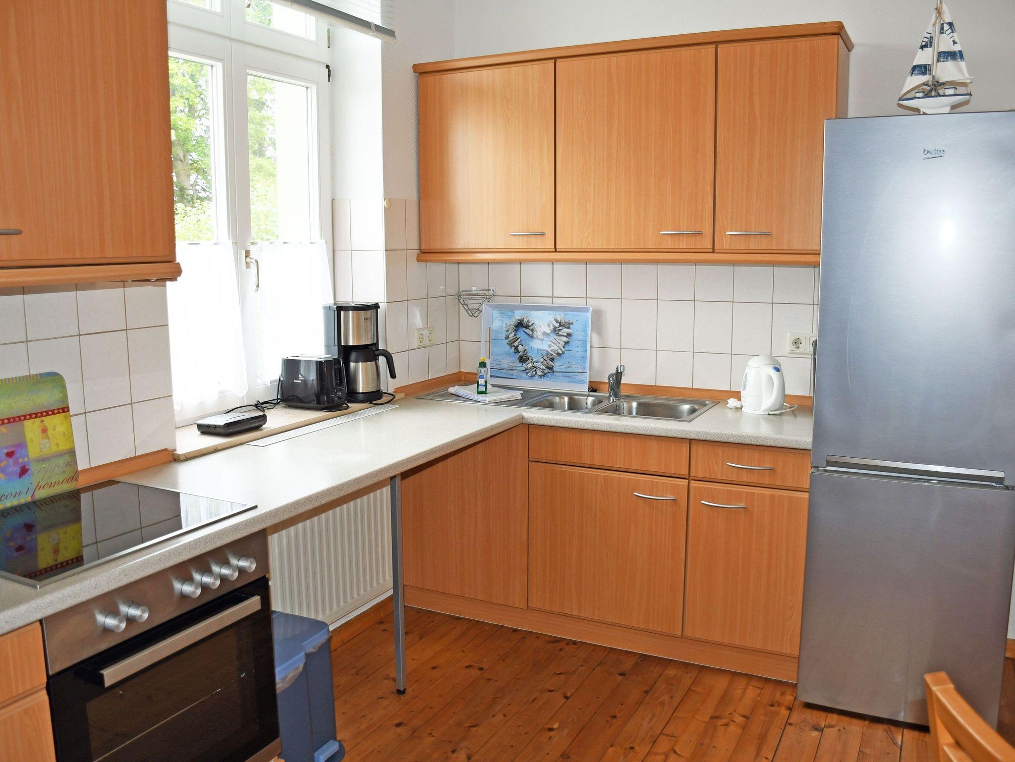 * 1 separate Küche mit Einbauküche ausgestattet mit: 4-Platten-Ceran-Kochfeld, Backofen, Dunstabzugshaube, Kühl-Gefrier-Kombination, Spüle, Mikrowelle, Toaster, Kaffeemaschine, Wasserkocher, kein Geschirrspüler, diverse Küchenutensilien, 1 Sitzecke mit Esstisch und 2 Stühlen, 1 Kinderhochstuhl