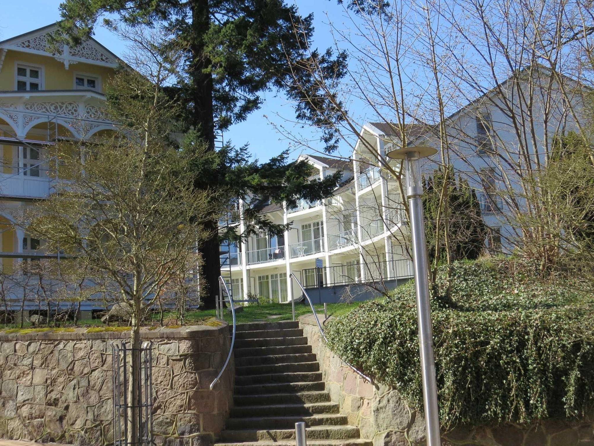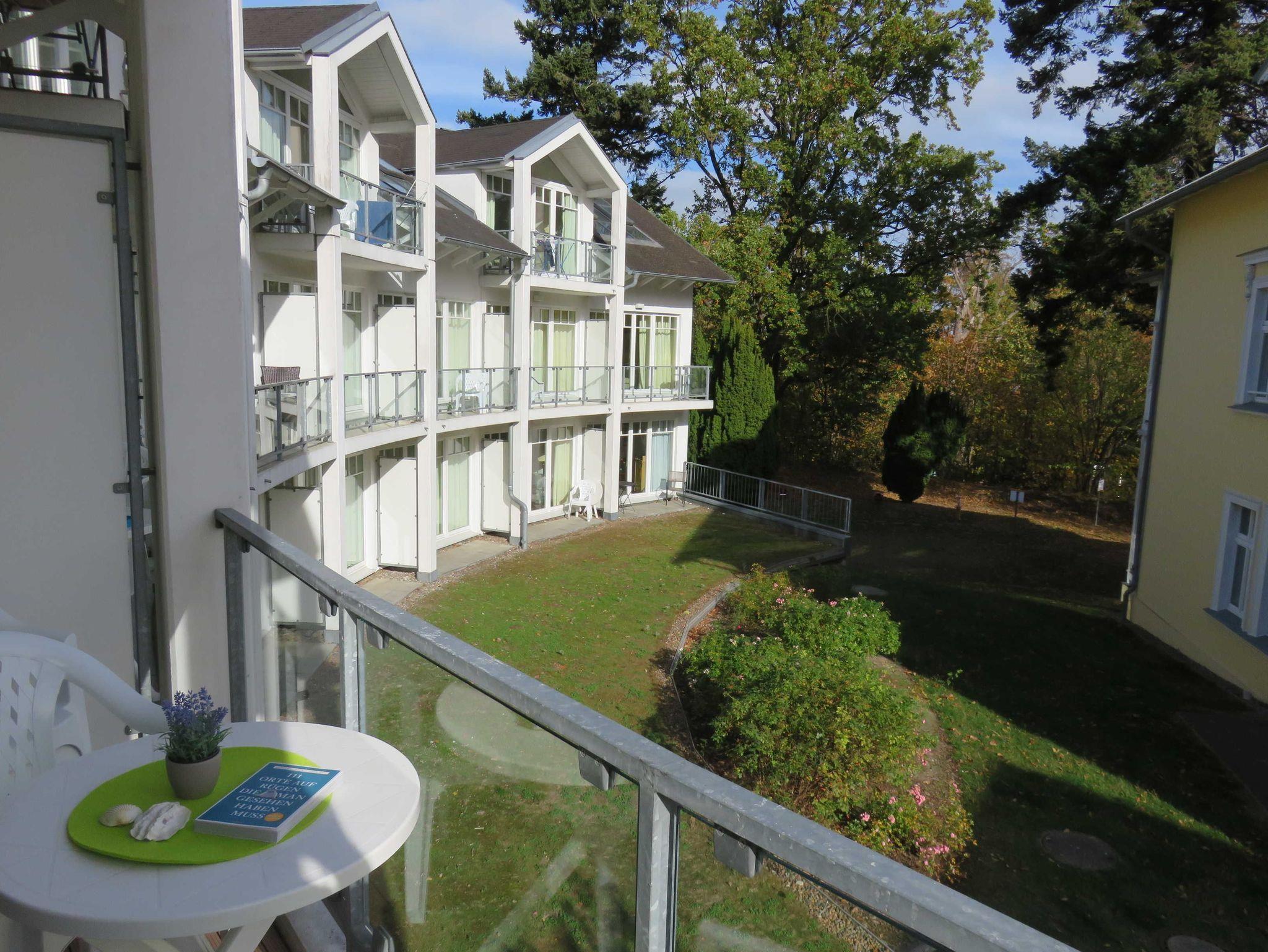 Hier blicken Sie ins Grüne der großzügigen Gartenanlage und auf die Waldpromenade; wenn die Bäume schwach belaubt sind, sogar bis auf die rauschende Ostsee.