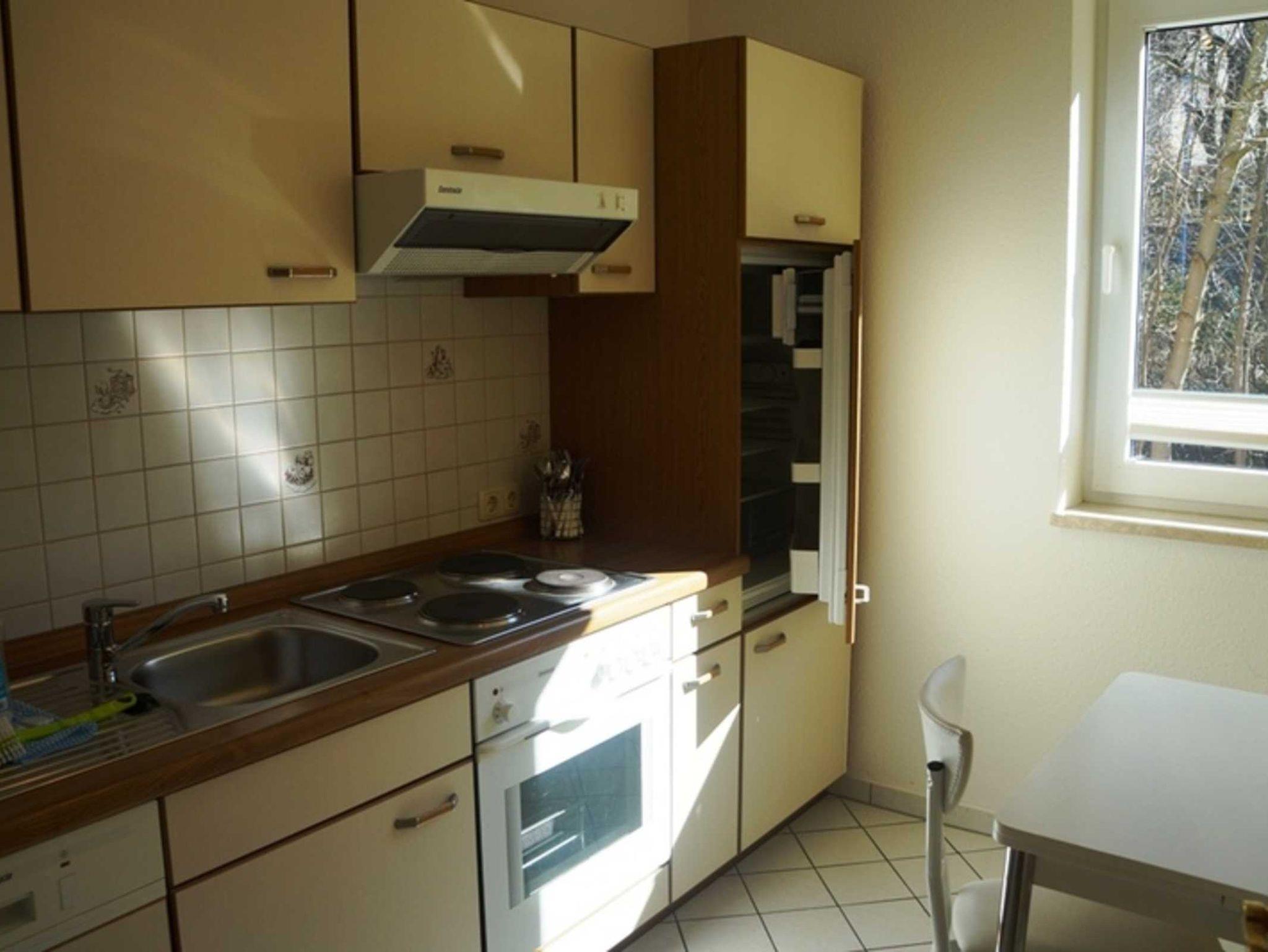 Zu der 3 Raum Ferienwohnung gehört ein Wohnzimmer mit Couch und TV ein Badezimmer mit Dusche und eine extra Küche. In der Küche befindet sich ein Backofen, ein Geschirrspüler und die zusätzliche komplette Ausstattung.