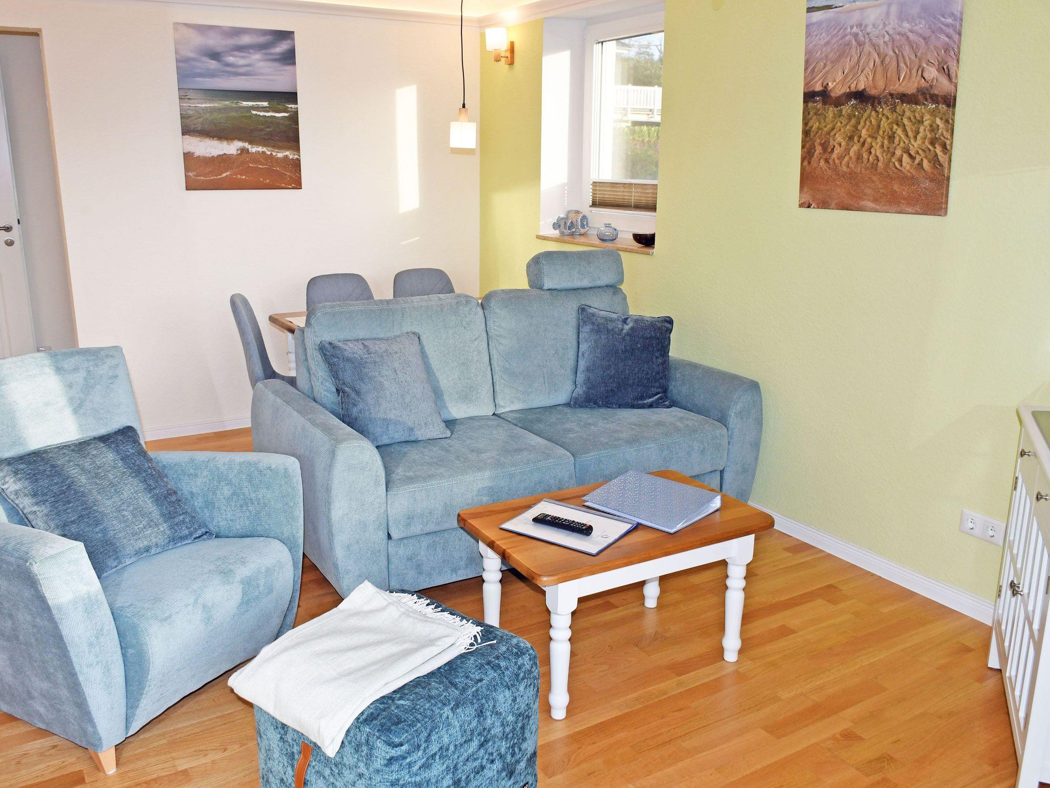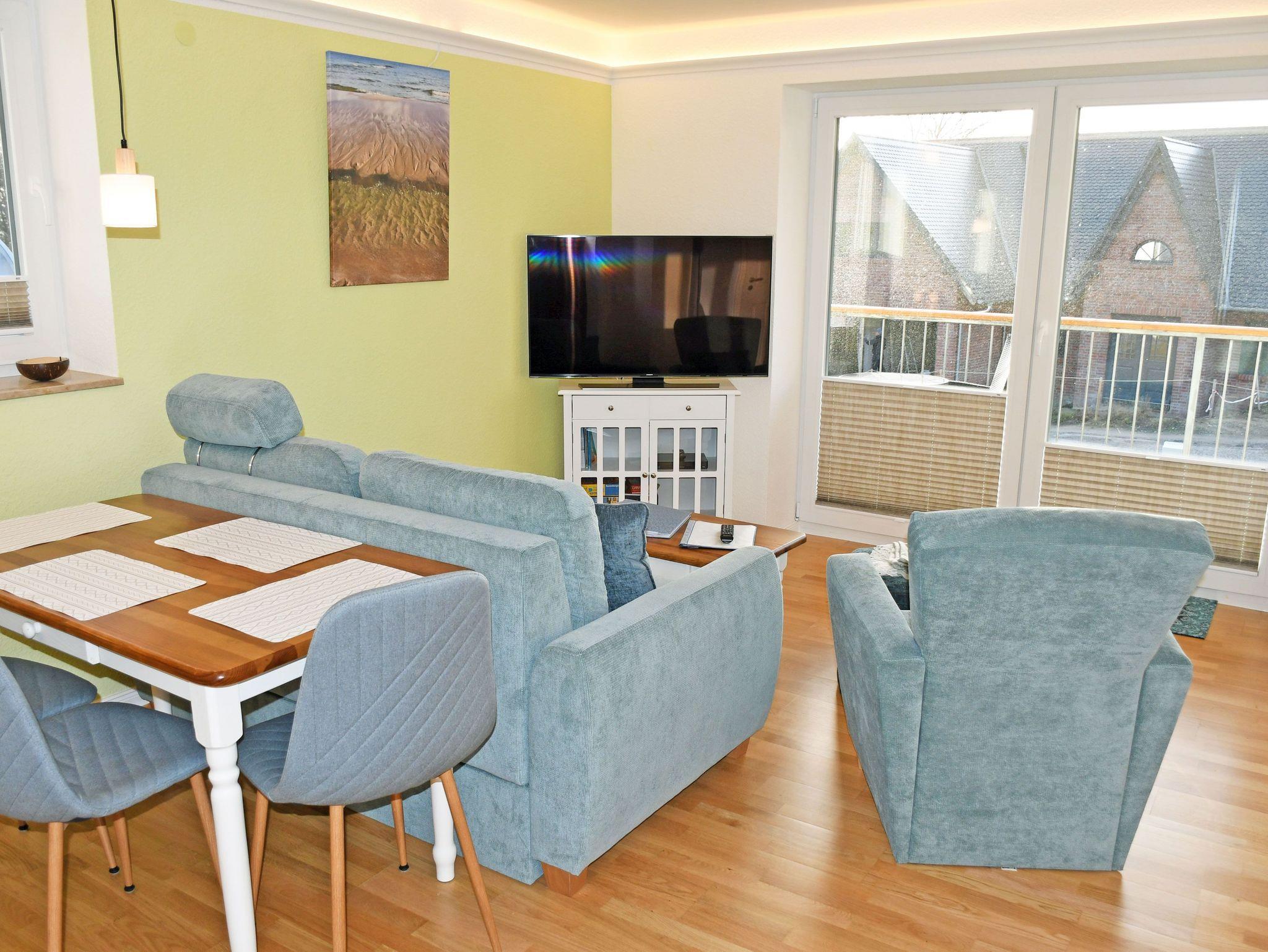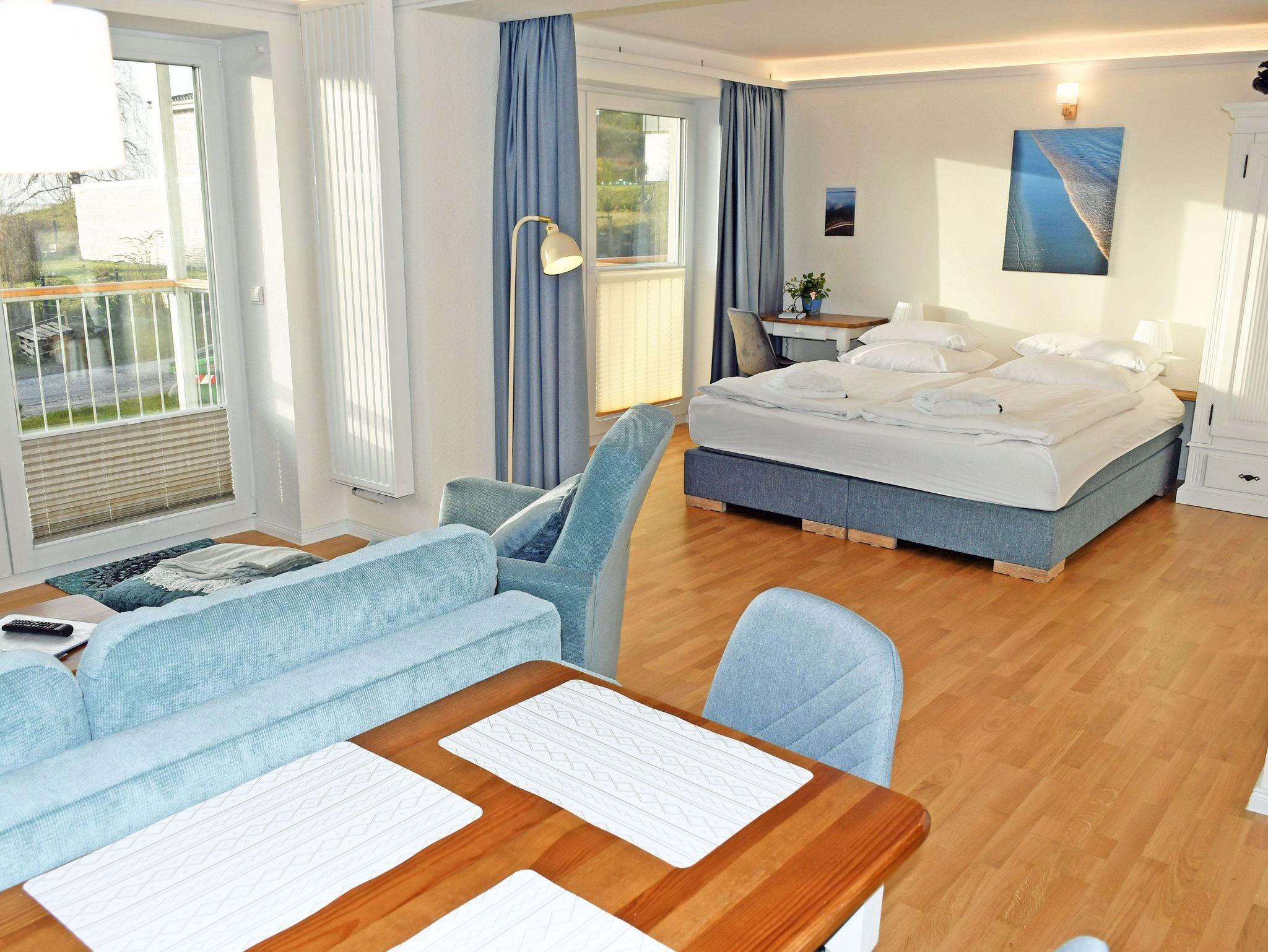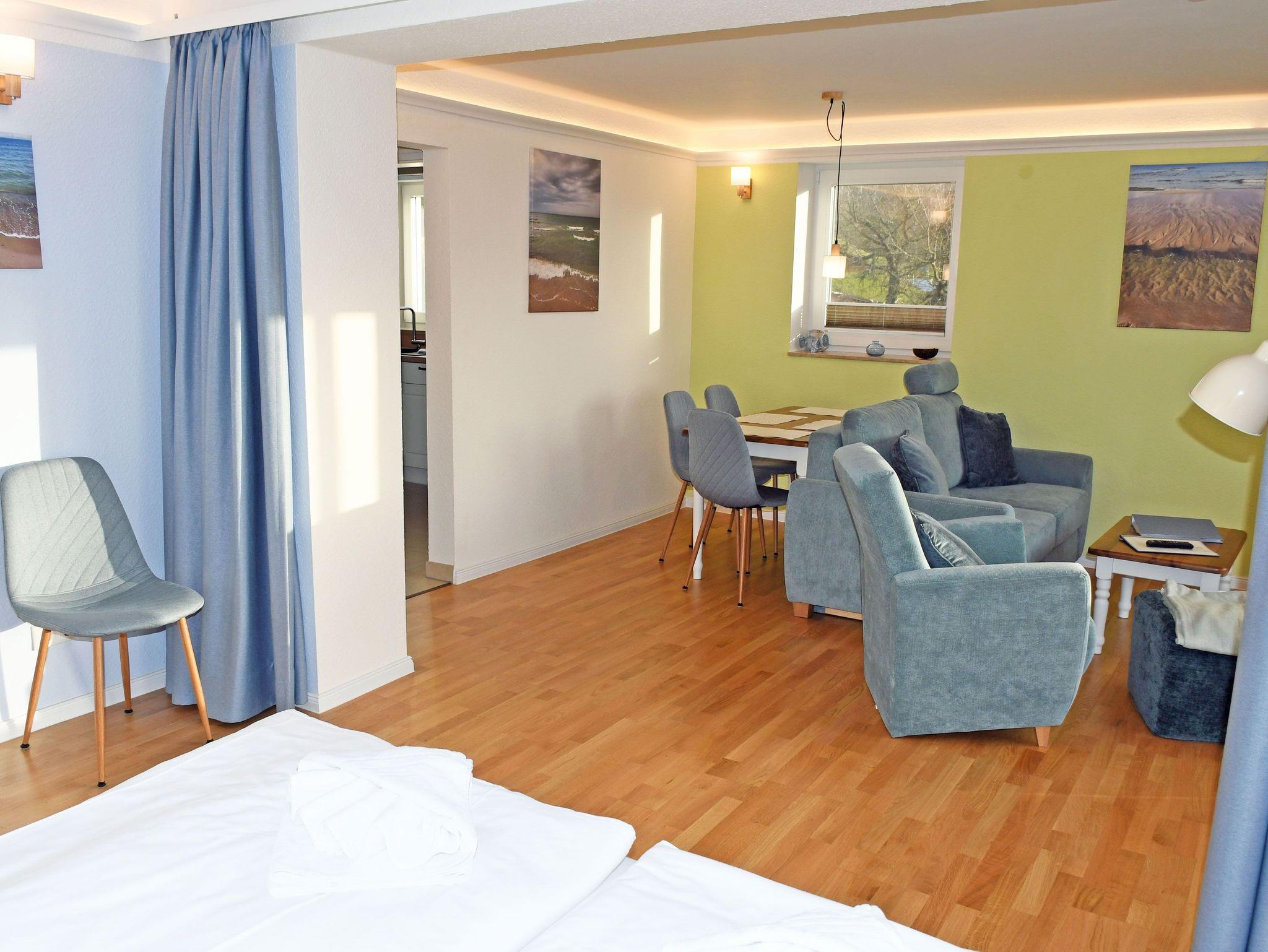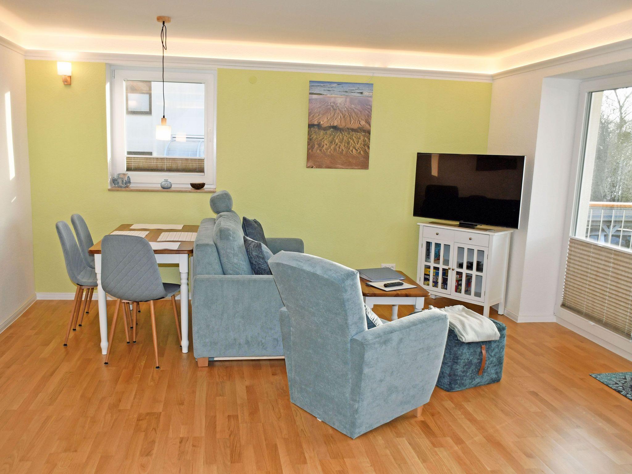 - Wohnbereich mit Schlafsofa, Sessel und Couchtisch, 48?-UHD-Smart-TV mit Netflix, Esstisch mit 3 Stühlen