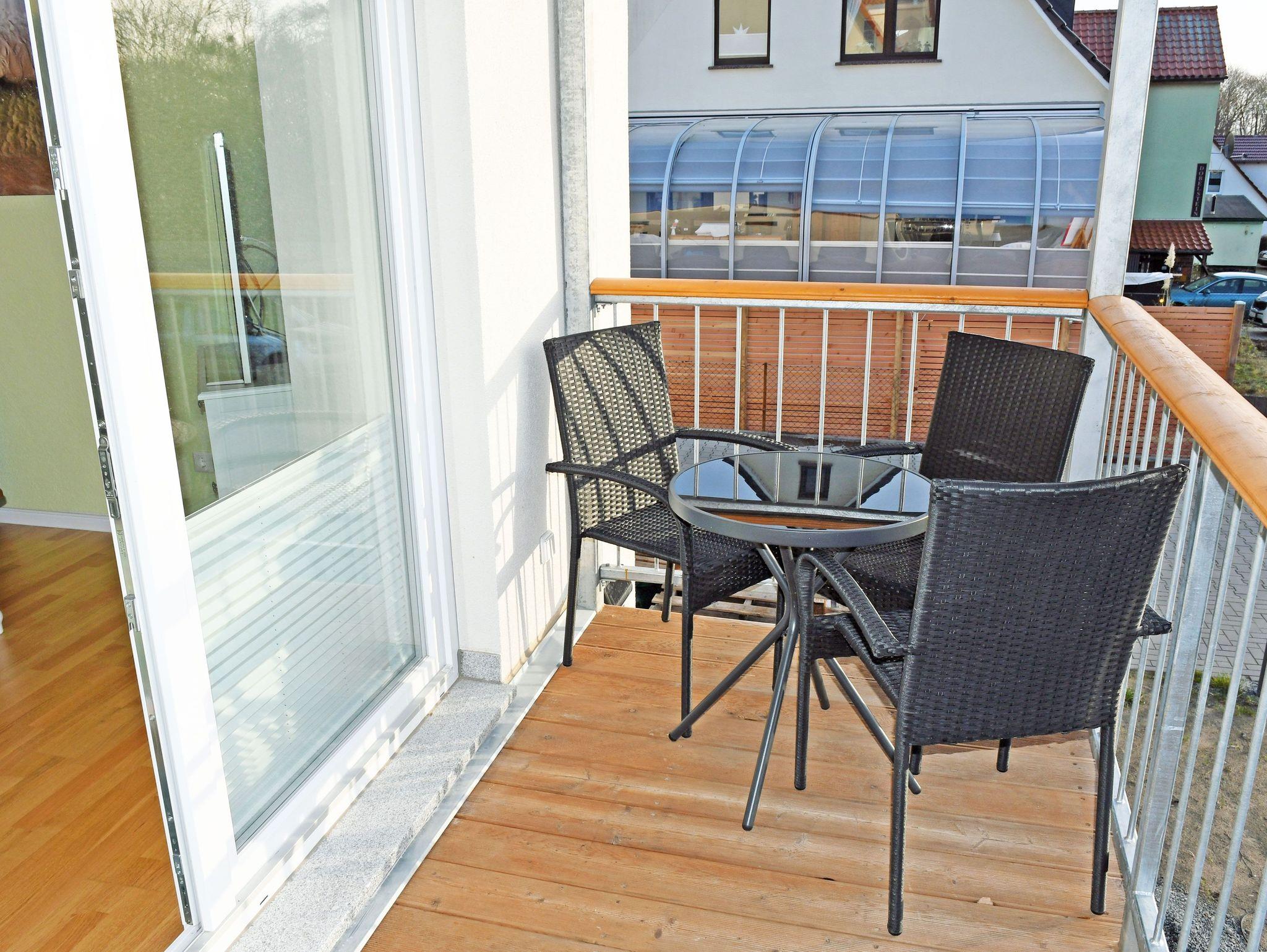 Der schöne Balkon mit Gartenmöbeln lädt zu gemütlichen Stunden ein. Hier können Sie die Abende bei einem Glas Wein ausklingen lassen und jederzeit die gute Ostseeluft und Sonne auf Rügen genießen.