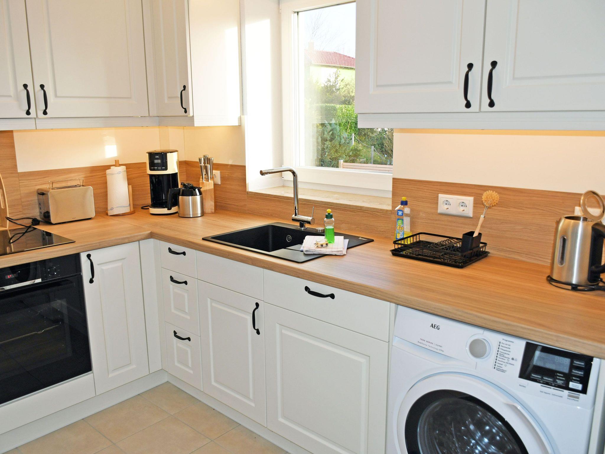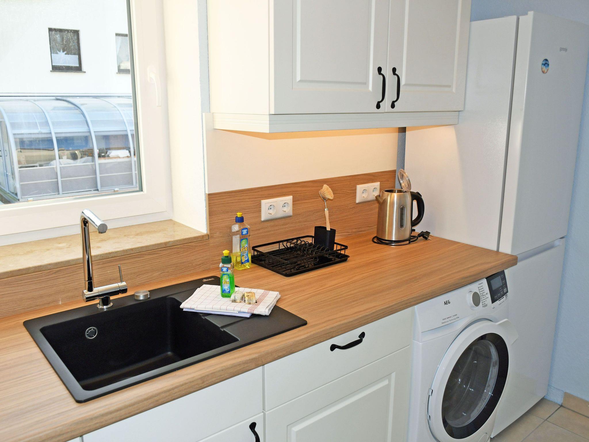 - Wasserkocher und hochwertigen Küchenutensilien sowie einem Waschtrockner