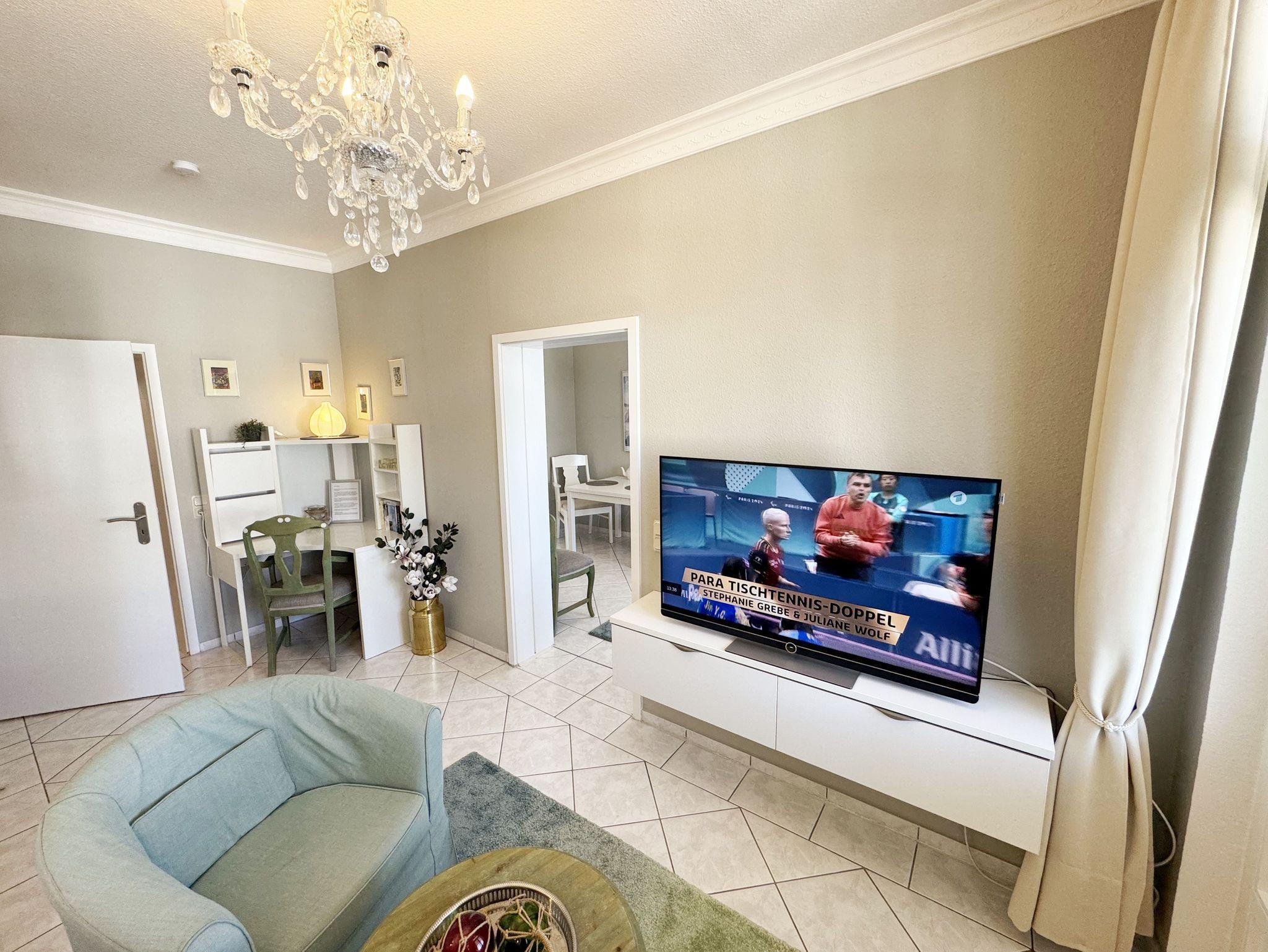 Die Nichtraucherferienwohnung Nr. 6 befindet sich im 1. Obergeschoss der denkmalgeschützten Villa Minna im Zentrum Göhrens, die im Stil der Seebäder-Architektur um 1900 gebaut wurde. Dank hoher Decken und guter Raumaufteilung wirkt sie mit Ihren ca. 64 qm hell und großzügig. Sie bietet Ihnen damit ausreichend Platz für mx. 2 bis 3 Personen. Im Eingangsbereich befindet sich ein beleuchteter Einbauschrank für Ihre Garderobe. Von hier betritt man den Wohnbereich, welcher über mehrere bequemen Sitzgelegenheiten verfügt. Die Couch hat eine Schlaffunktion zum Ausziehen (1,80m x 2,00m) für die 3. Person. Eine Leselampe, ein Smart-TV, ein WLAN-Zugang sowie ein Schreibtisch mit kleiner Gästebibliothek sorgen für Unterhaltung. Vom Wohnbereich aus betritt man ein gemütlich eingerichtetes Esszimmer mit einem Buffett, einem Essplatz sowie einer Ottomane. Daran angeschlossen kommt man in die separate Küche mit einem Ceranfeld, einem Backofen, einem Kühlschrank mit Gefrierfach, einem Geschirrspüler, einer Kaffeemaschine, einem Wasserkocher, einem Toaster, einer Senseo-Padmaschine, einer Mikrowelle sowie alle gängigen Küchenutensilien. Der 15 m² große und bestuhlte Balkon (Norden) mit Überdachung und seitlichem Wind- und Sichtschutz, der sowohl vom Wohnbereich als auch vom Esszimmer her betreten werden kann, lädt auch bei Schietwetter zum draußen Verweilen ein. Bei hoffentlich stets gutem Wetter kann man hier frühstücken oder auch das Treiben des Ortes genießen. Das Schlafzimmer, welches man vom Eingangsbereich erreicht, liegt auf der Rückseite des Hauses. Ein Doppelbett (1,80m x 2,00m), Nachttischablagen mit Beleuchtung, ein großer Kleiderschrank mit Safe, Insektenschutzgitter sowie Verdunklungsmöglichkeiten runden den Raum ab. Das Tageslicht-Bad liegt neben dem Schlafzimmer und verfügt über eine ebenerdige Dusche, einen Waschplatz, einen Kosmetikspiegel, ein WC, einen Fön sowie einem Handtuchtrockner. Ein Gäste-WC mit Waschplatz befindet sich im Eingangsbereich. Ihre geliehenen oder mitgebrachten Fahrräder können Sie im Keller des Hauses unterstellen. Zusätzlich können Sie hier auch eine Waschmaschine und einen Trockner, gegen eine Extragebühr nutzen. Haustiere sind in der Wohnung nicht erlaubt. Ihr PKW-Stellplatz (Nr.06) befindet sich hinter dem Haus. Die Erstausstattung eines Wäschepaketes (komplette Bettwäsche, 1 Duschhandtuch, 2 kleine Handtücher) können Sie bis 14 Tage vor Anreise gegen einen Aufpreis dazu buchen oder durch eigene ergänzen. Ab 2 gebuchten Paketen erhalten Sie einmalig 1 Geschirrhandtuch und 1 Duschvorleger hinzu.