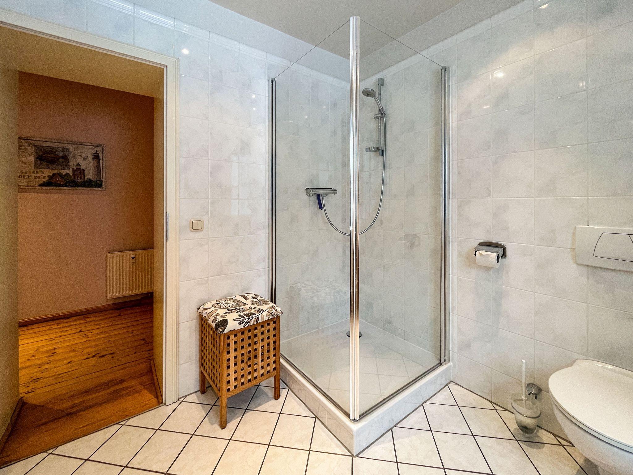 Im geräumigen Tageslicht-Badezimmer finden sie WC und Dusche vor.