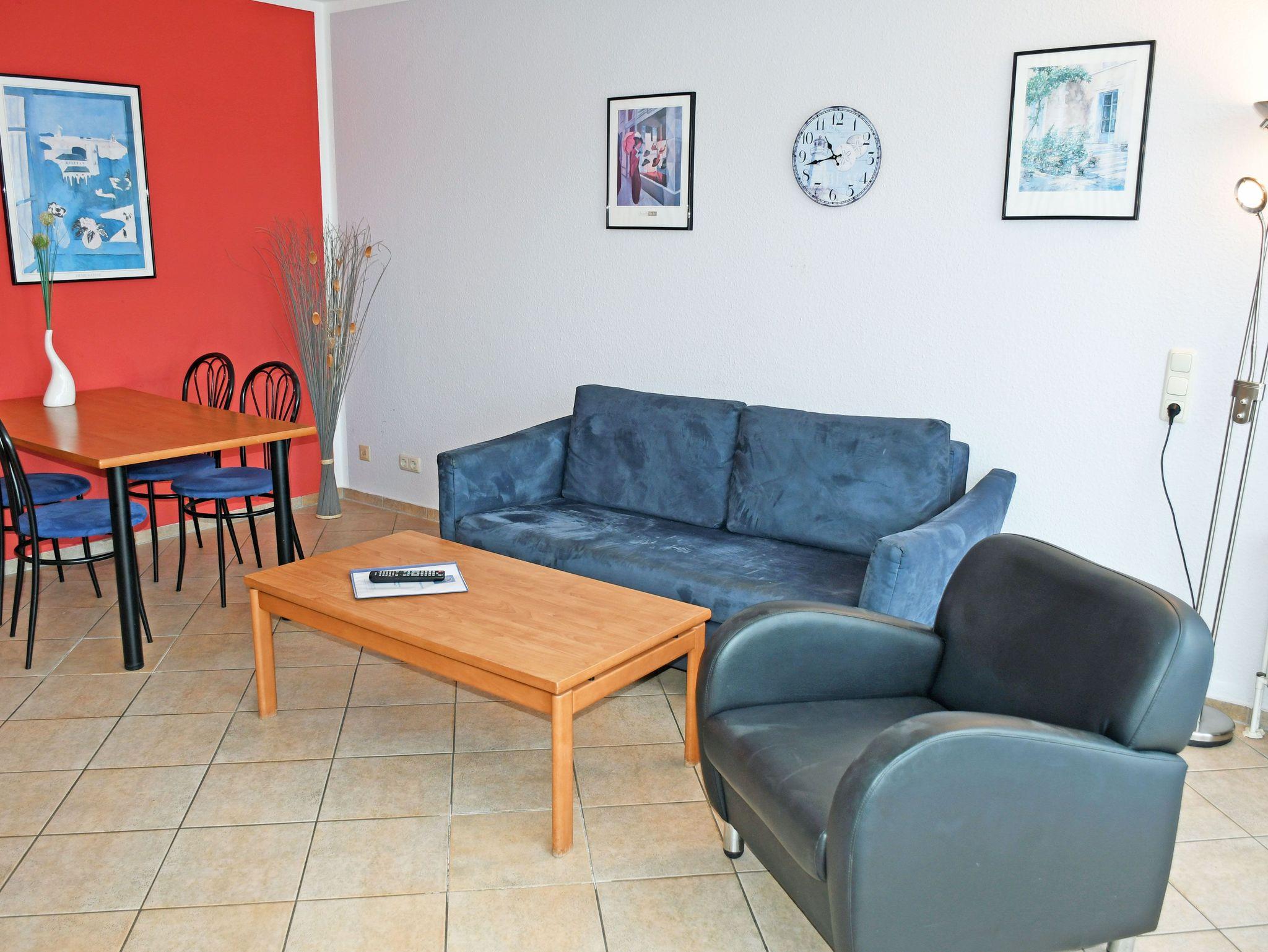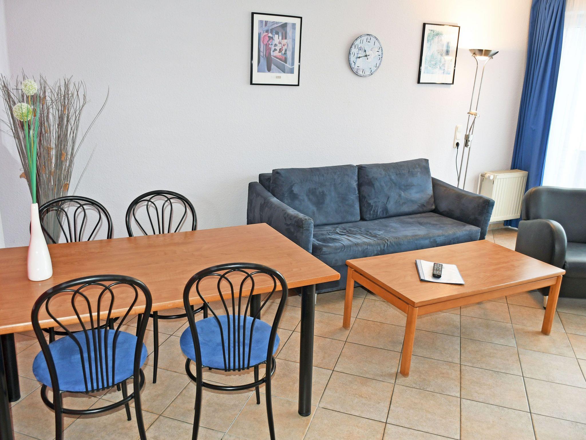 * Wohnbereich mit ausziehbarer, moderner Doppelbettschlafcouch (150 x 200 cm), 2 Sesseln, Couchtisch, Anrichte, Flat-TV, CD-Radio-Anlage und Esstisch mit 4 Stühlen