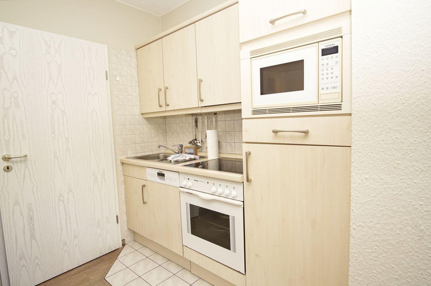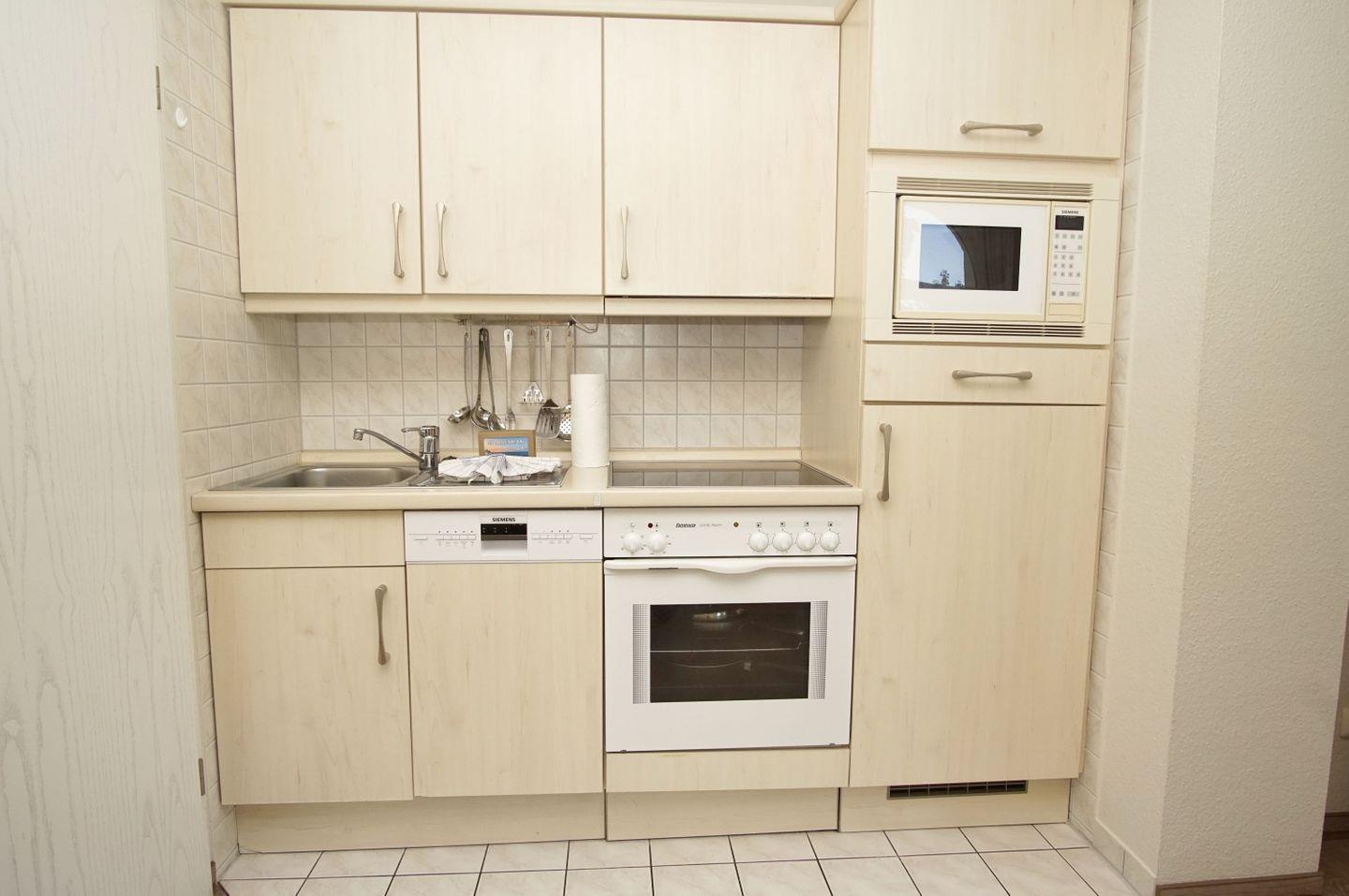 KÜCHE // Küchenzeile, 4-Platten-Herd, Spülmaschine, Kühlschrank mit Gefrierfach, Backofen, Mikrowelle, Toaster, Wasserkocher, Kaffeemaschine, reichlich Besteck, Geschirr und Küchenutensilien ++