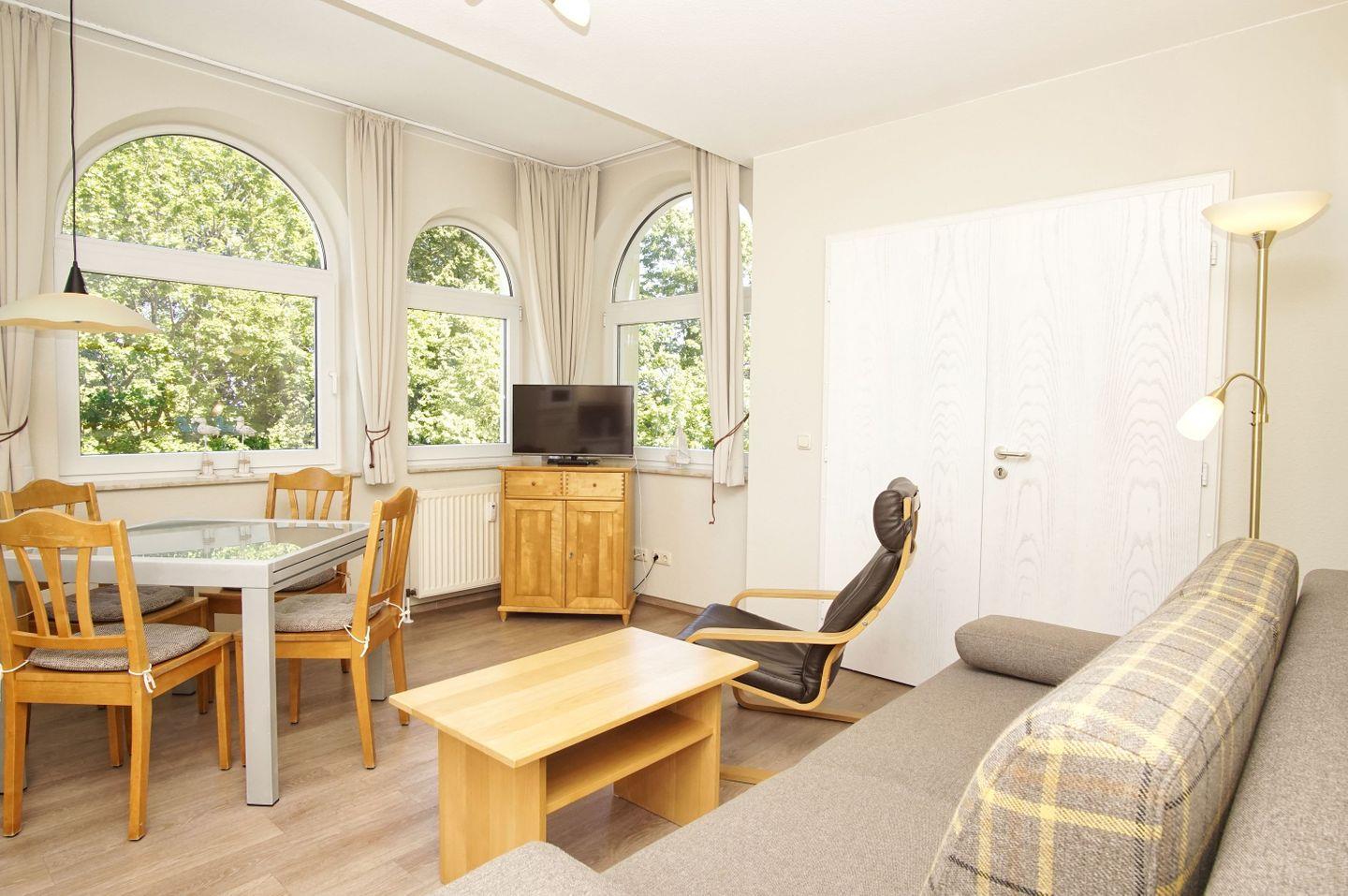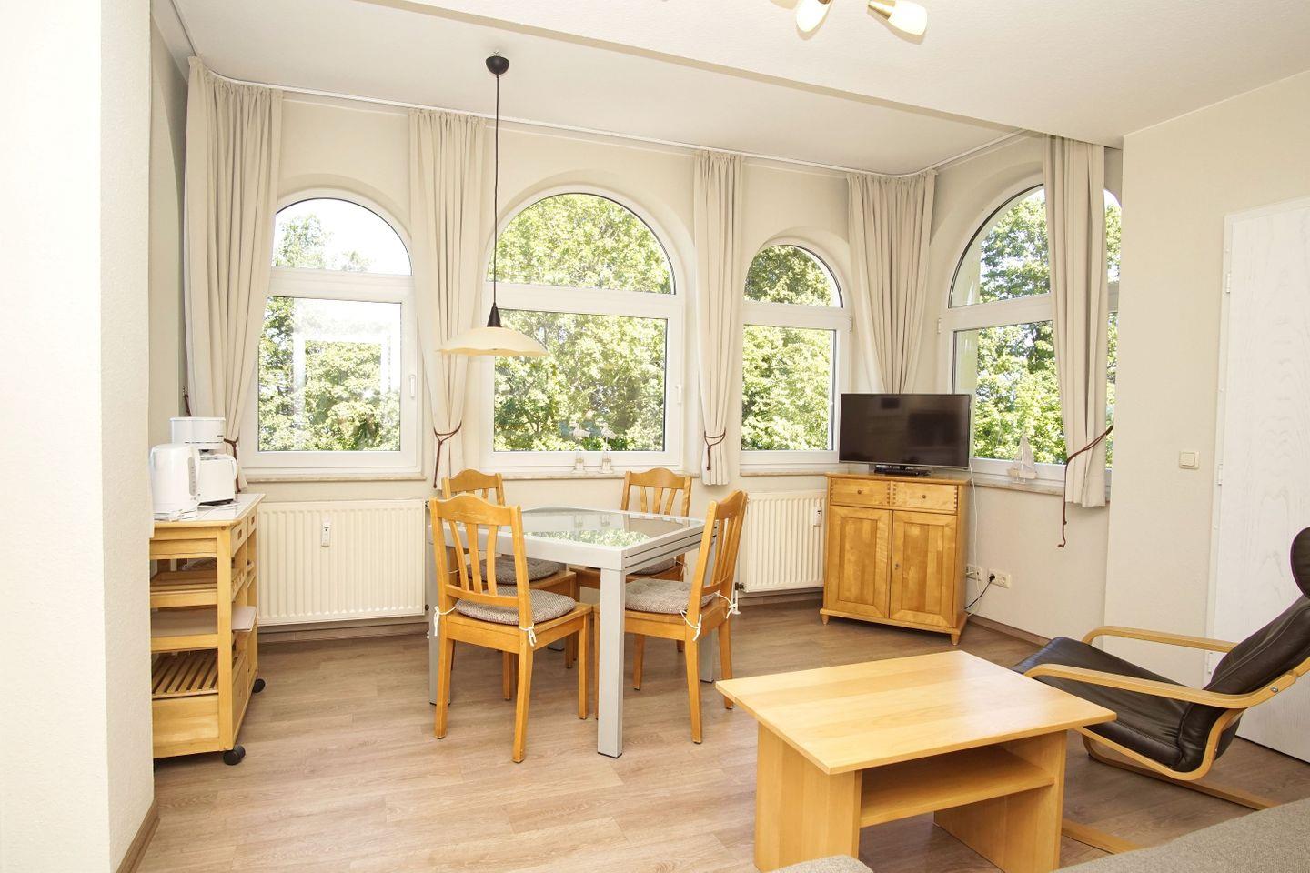 In der Ferienwohnung können bis 4 Personen unterkommen und den Urlaub auf der Insel genießen. Eine komfortable Einrichtung, bei der es Ihnen an nichts fehlen wird, erwartet Sie. Vom großen, ausladenden Sonnenbalkon der Wohnungen Typ C können Sie die Ostsee zwischen den Blättern der urigen Buchen und Eichen des umgebenden Naturschutzgebietes durchblitzen sehen.