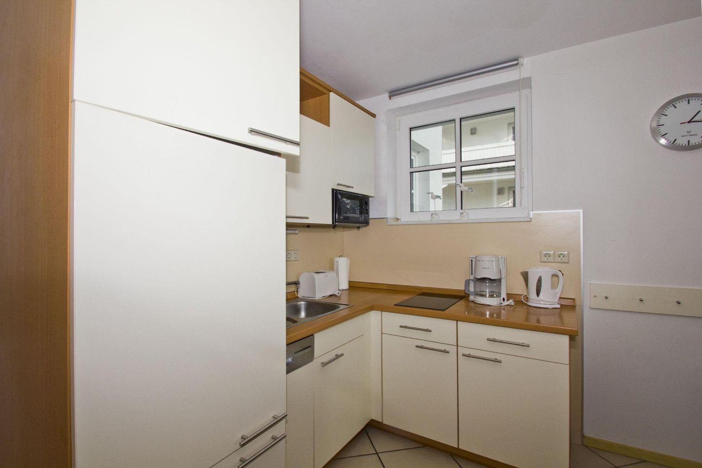 KÜCHE // Küchenzeile, 2-Feld Ceranfeld, Kühlschrank mit Gefrierfach, Geschirrspüler, Toaster, Wasserkocher, Kaffeemaschine, reichlich Besteck, Geschirr und Küchenutensilien ++