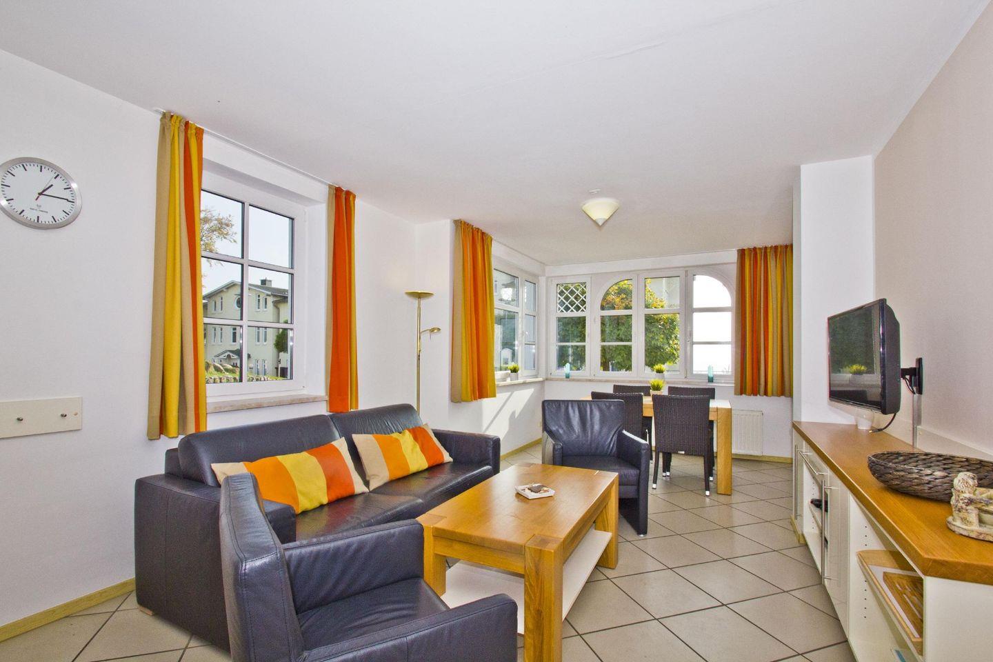 WOHNEN // Wohnraum mit Essbereich, Esstisch mit 4 Stühlen, Sitzgarnitur, Couch mit Schlaffunktion, Kabel-TV, Radio, CD-Player ++