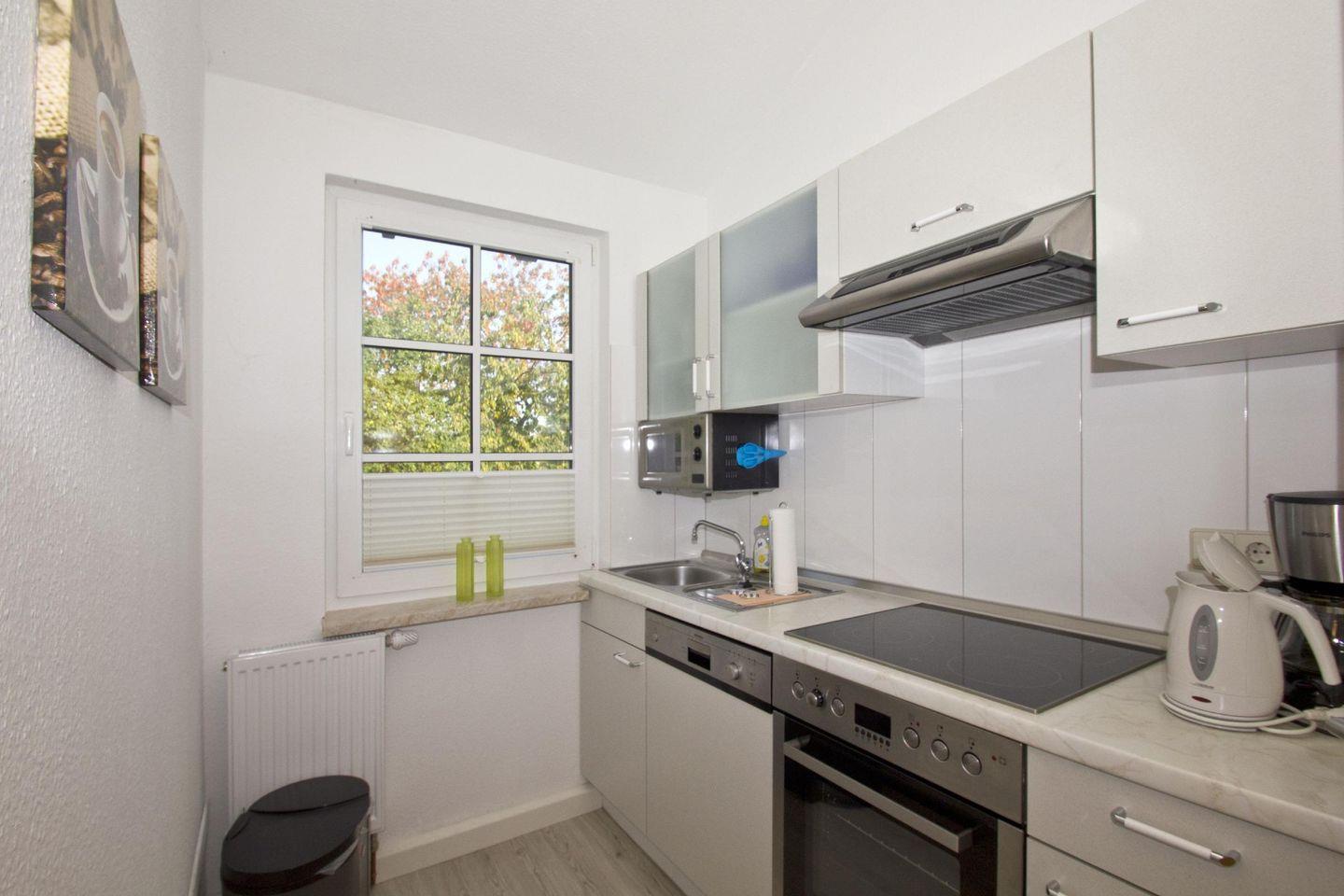 KÜCHE // Küchenzeile, 4-Feld Ceranfeld, Kühlschrank mit Gefrierfach, Backofen, Geschirrspüler, Toaster, Wasserkocher, Kaffeemaschine, reichlich Besteck, Geschirr und Küchenutensilien ++