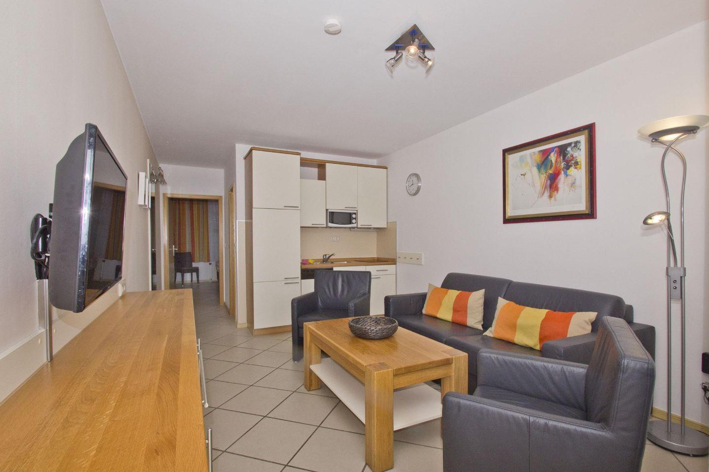 WOHNEN // Wohnraum mit Essbereich, Esstisch mit 4 Stühlen, Sitzgarnitur, Couch mit Schlaffunktion, Kabel-TV, Radio, CD-Player ++