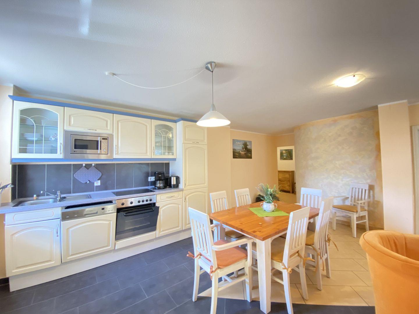 KÜCHE // offene Küche, 4-Platten Ceranherd, Spülmaschine, Kühlschrank mit Gefrierfach, Backofen, Mikrowelle, Toaster, Wasserkocher, Kaffeemaschine, reichlich Besteck, Geschirr und Küchenutensilien ++