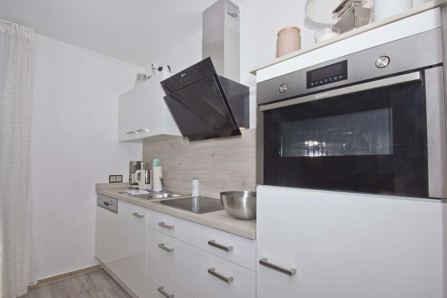 KÜCHE // Küchenzeile, Cerankochfeld (4-Platten), Spülmaschine, Kühlschrank mit Gefrierfach, Backofen, Toaster, Wasserkocher, Kaffeemaschine, reichlich Besteck, Geschirr und Küchenutensilien ++