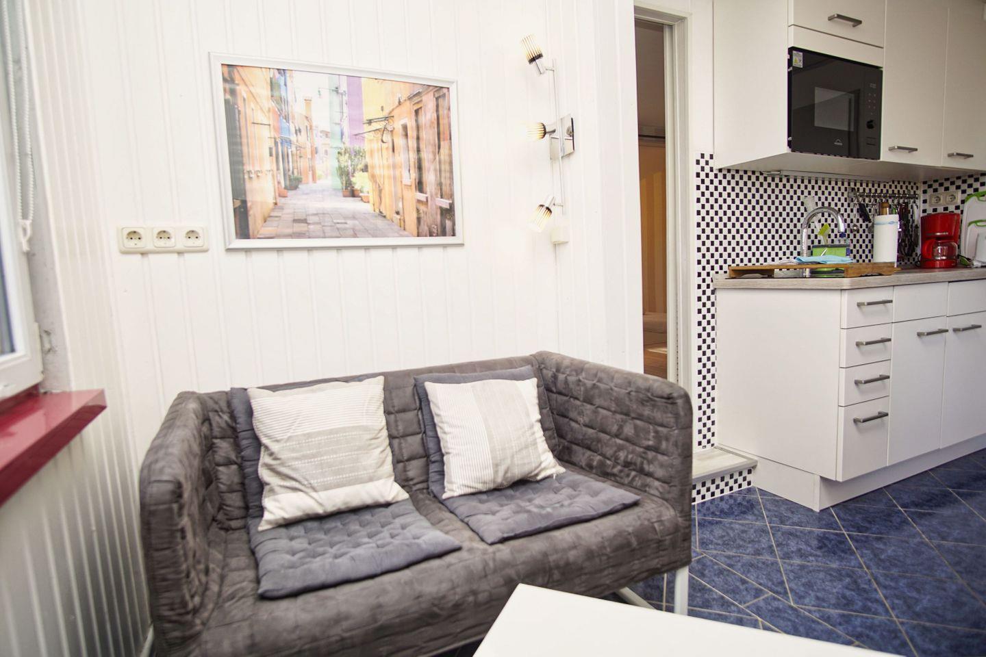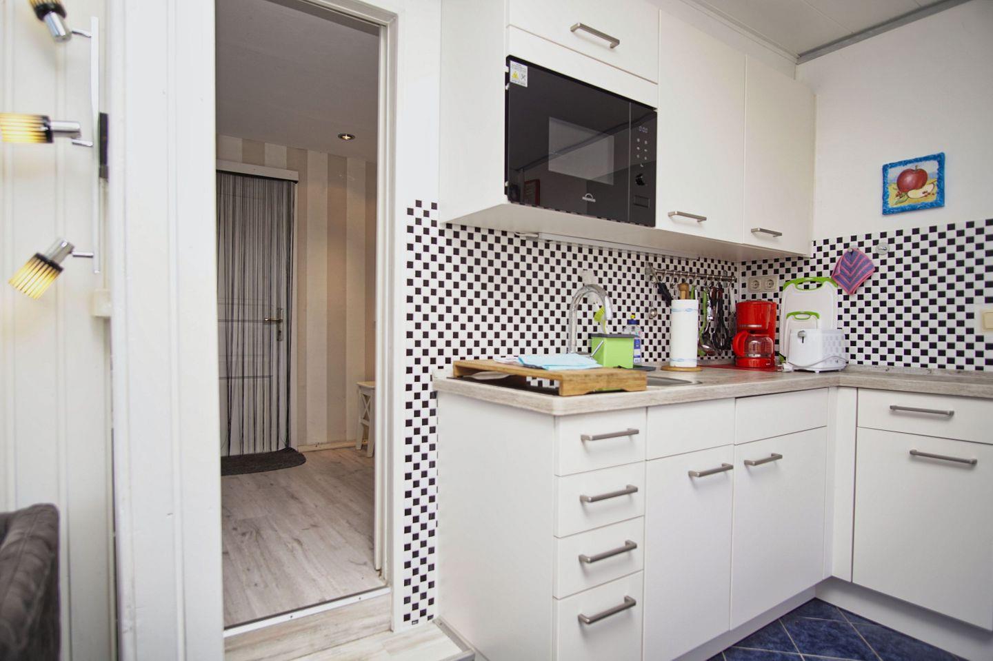KÜCHE // offene Küche, 2-Felder Ceranherd, Kühlschrank mit Gefrierfach, Mikrowelle, Toaster, Wasserkocher, Kaffeemaschine, reichlich Besteck, Geschirr und Küchenutensilien ++