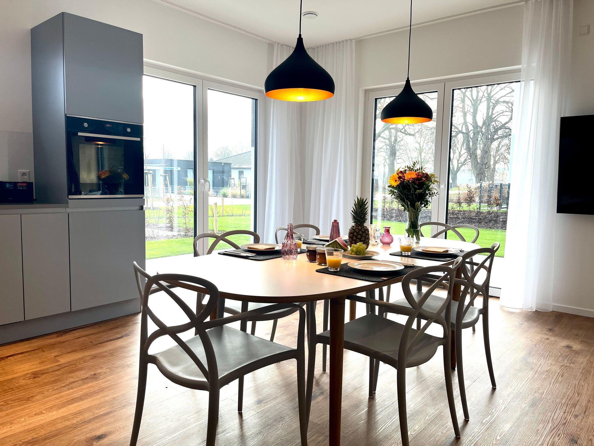 In zwei spiegelbildlich baugleiche Doppelhaushälften aufgeteilt, erwartet Sie exklusiver Komfort auf jeweils 140 m² Wohnfläche. Platz genug für je 6 Personen und Babybett.