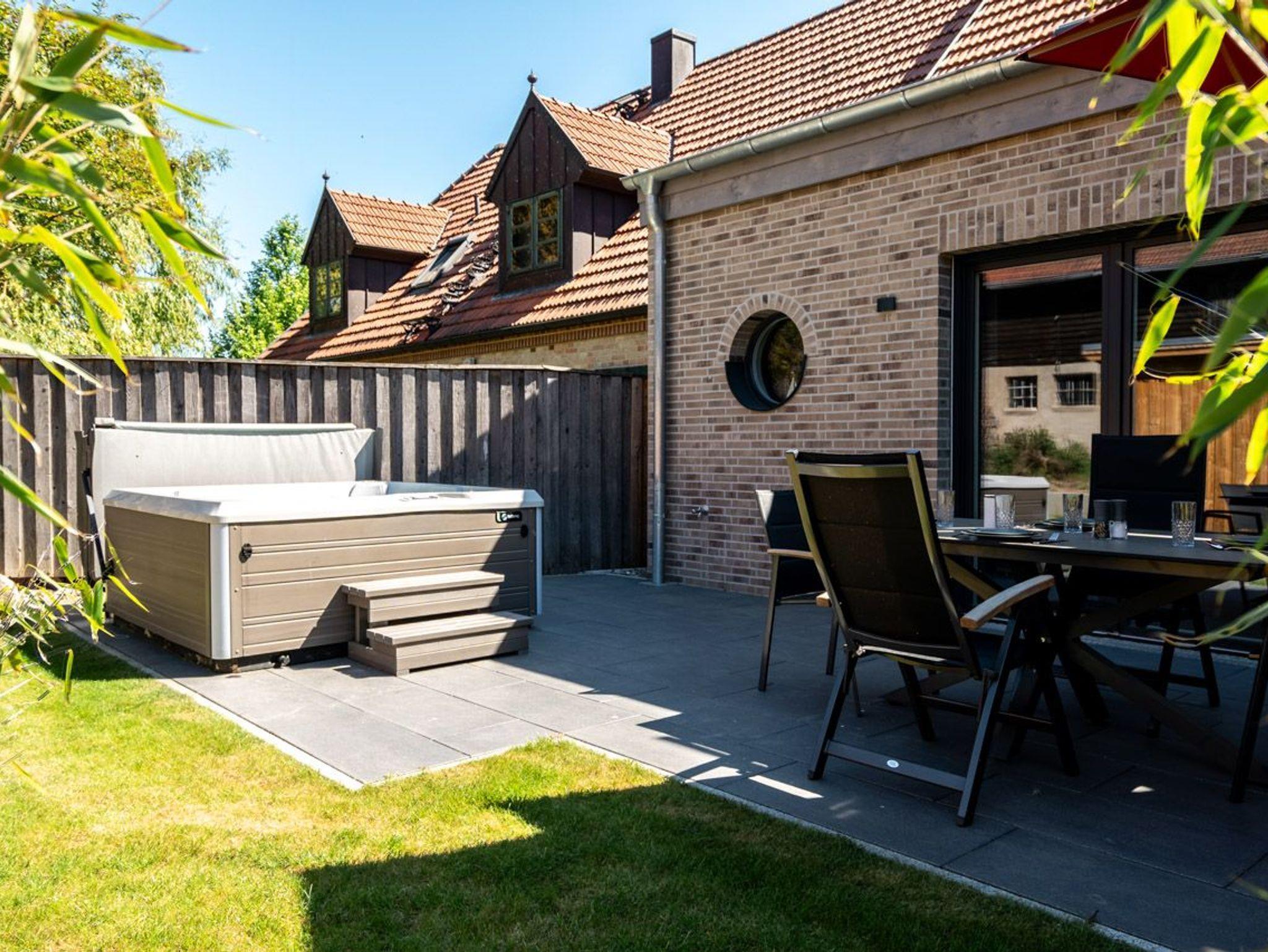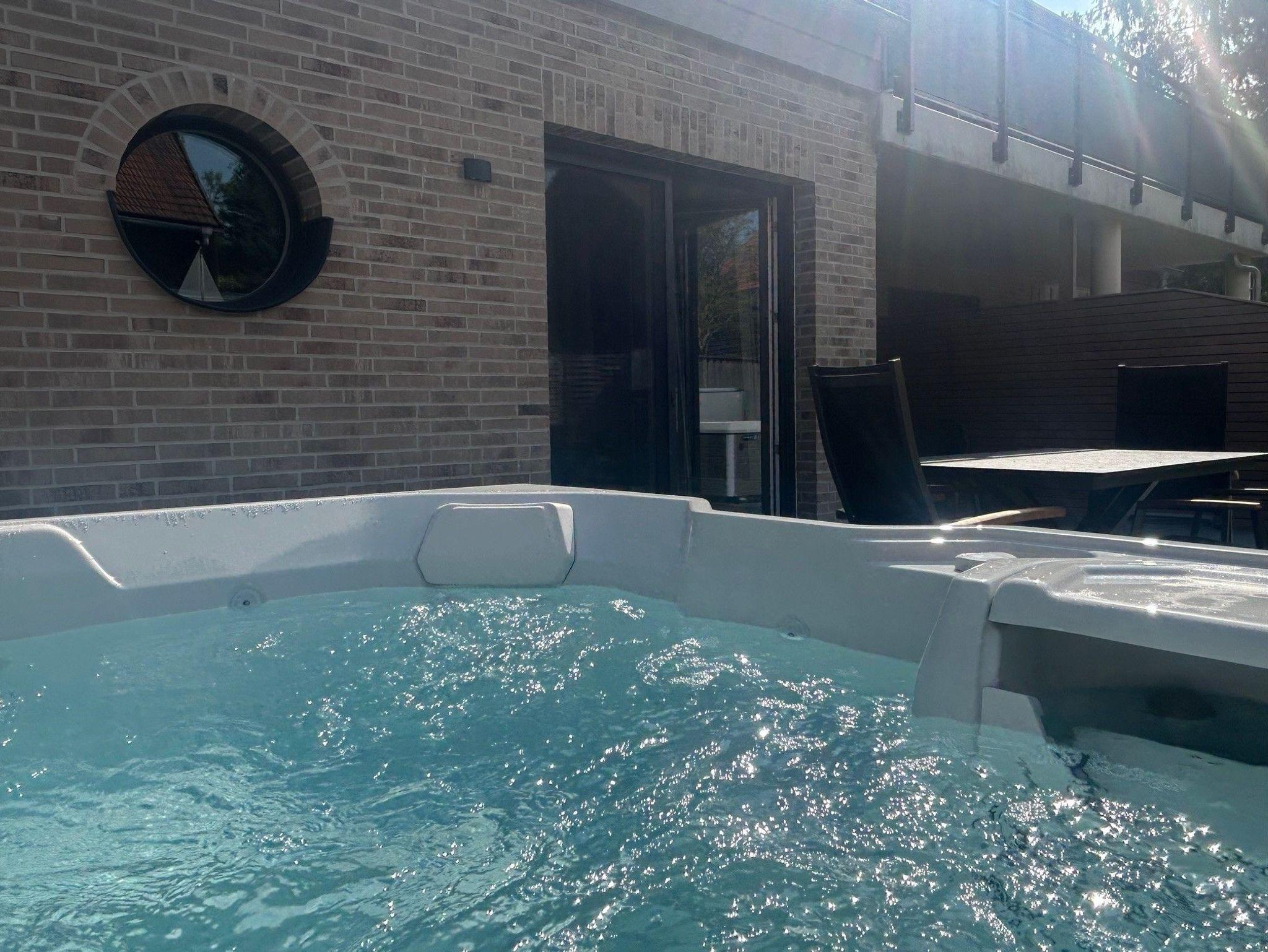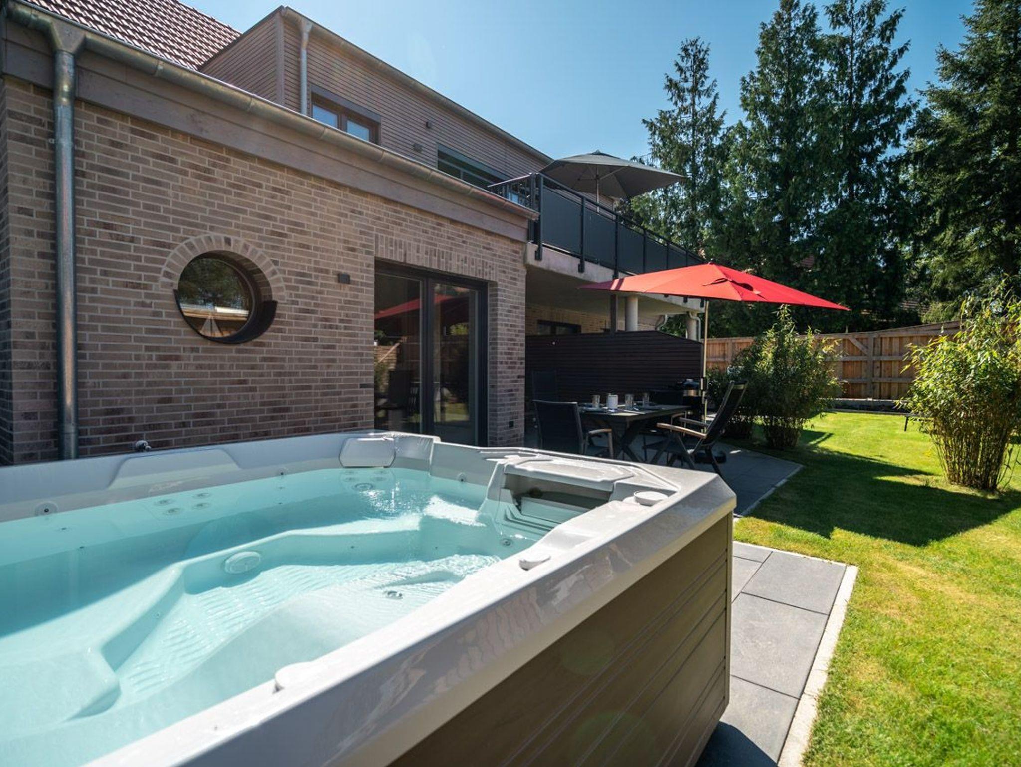 Die Terrasse mit einem Außen-Whirlpool ist ein Highlight dieser Wohnung und lädt dazu ein, unter freiem Himmel zu entspannen. Der gemeinschaftlich genutzte Garten bietet Platz, um die Natur zu erleben und sich zu erholen.