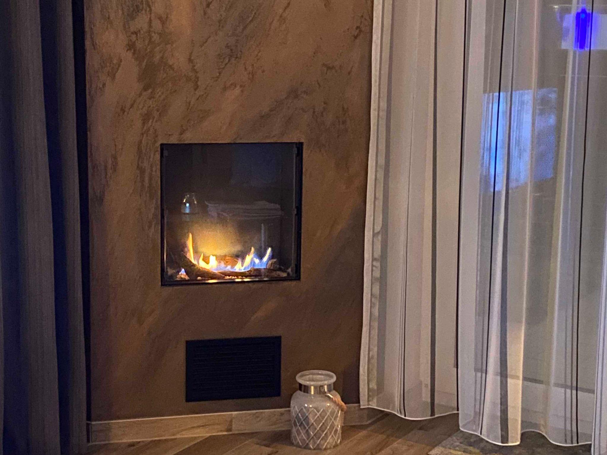 guten Glas Wein vor dem hochwertigen Gaskamin ein.