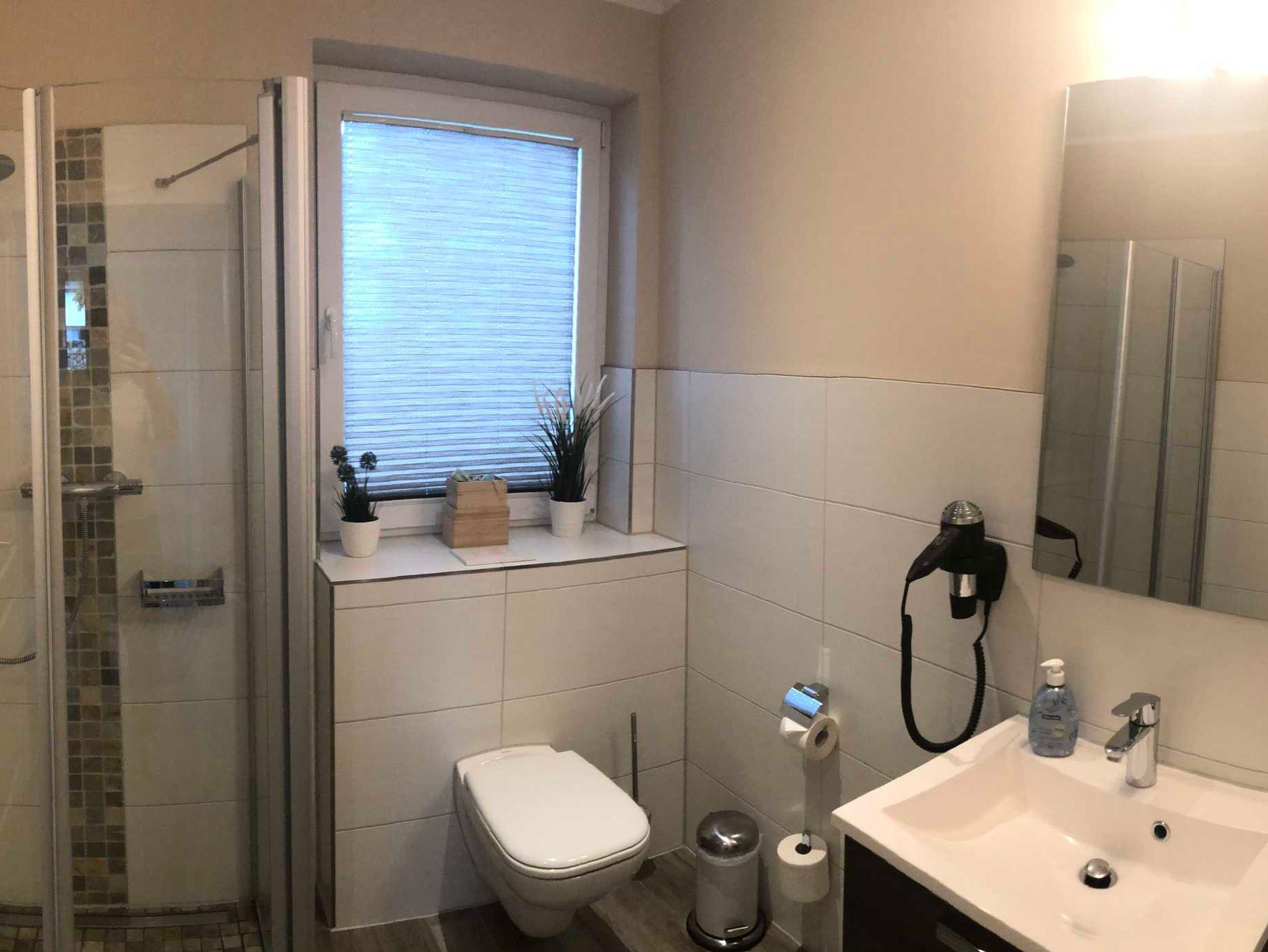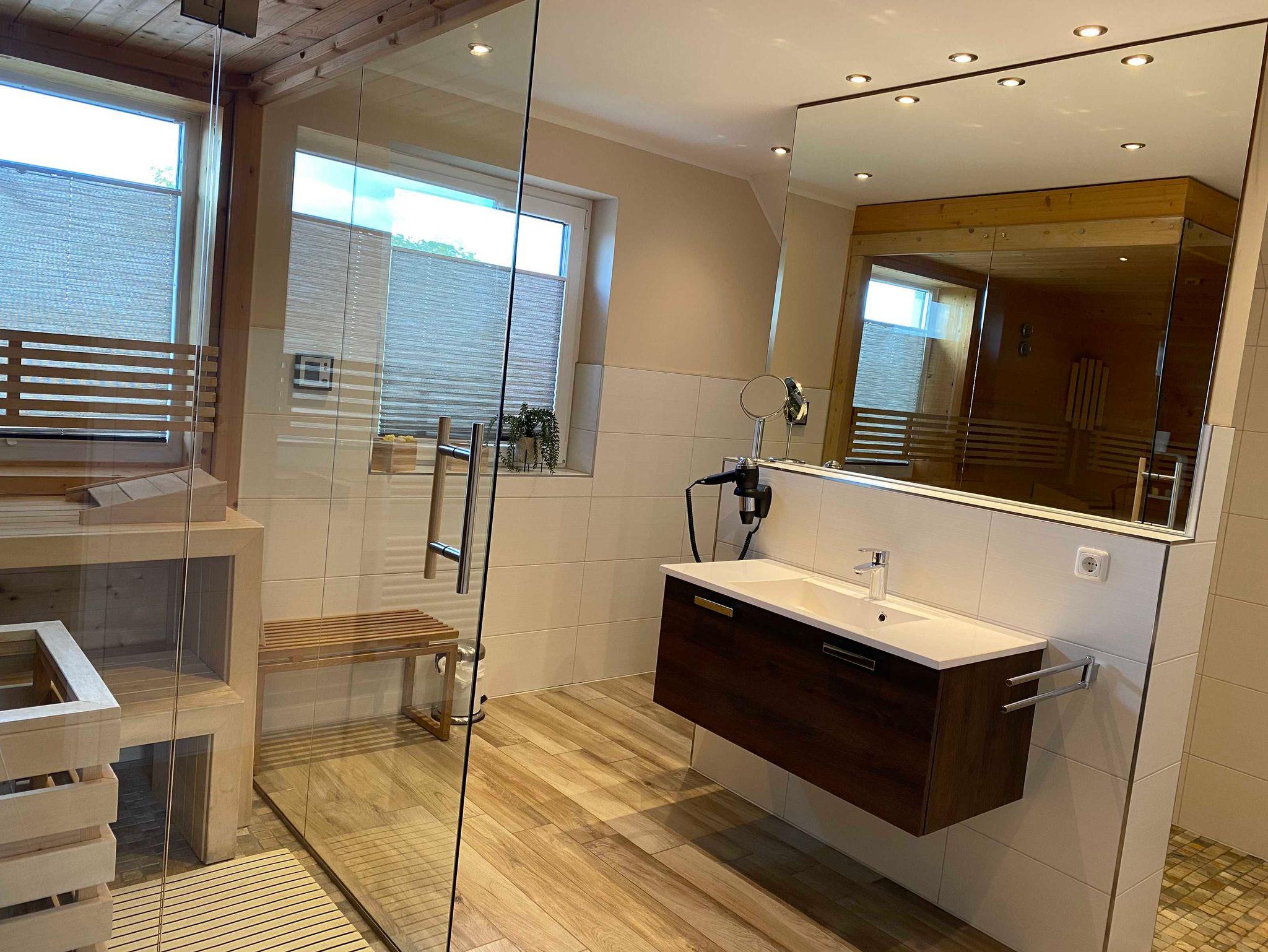 verglasten Sauna mit Fenster im OG-Bad. Eine im Duschbereich zusätzlich installierte