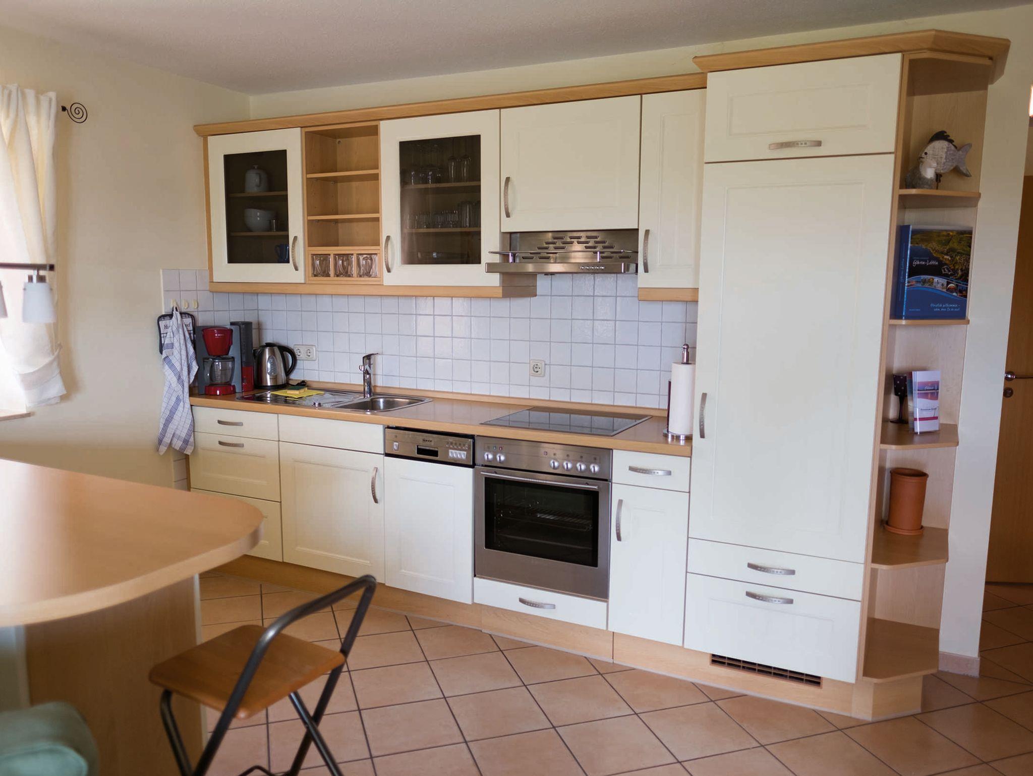 Auch das Kochen macht in der gut ausgestatteten Markeneinbauküche Spaß. Die zum Wohnraum offene Landhaus-küche ?lädt zum Sitzen am Tresen ein und auch Hobby-Köche finden alles, was das Herz begehrt. Die ?Ausstattung umfasst einen Kühlschrank, einen Herd mit Backofen, Geschirrspüler, Kaffeemaschine, Wasserkocher, Toaster und mehr. Geschirr und Gläser finden Sie in ausreichender Menge.