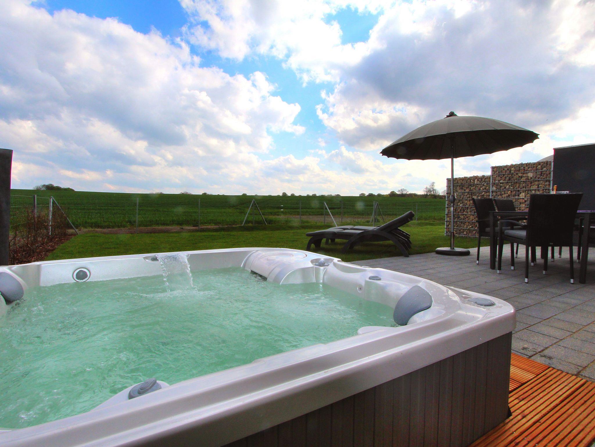 Der Außenwhirlpool im 150m² großen Garten verspricht erholsame Stunden unter freiem Himmel. Tauchen Sie ein und genießen Sie die entspannende Massage der sprudelnden Massagedüsen. Die Terrasse mit gemütlichen Gartenmöbeln lädt zu gemeinsamen Grillabenden ein.