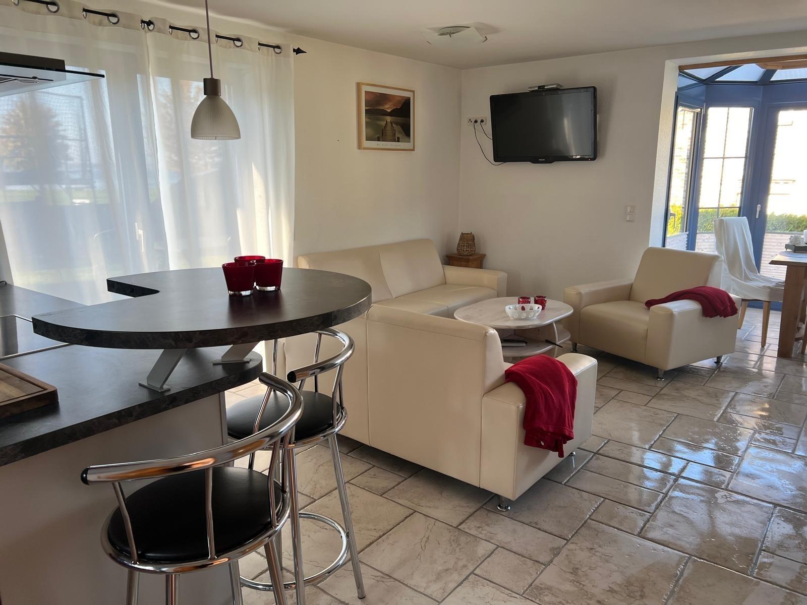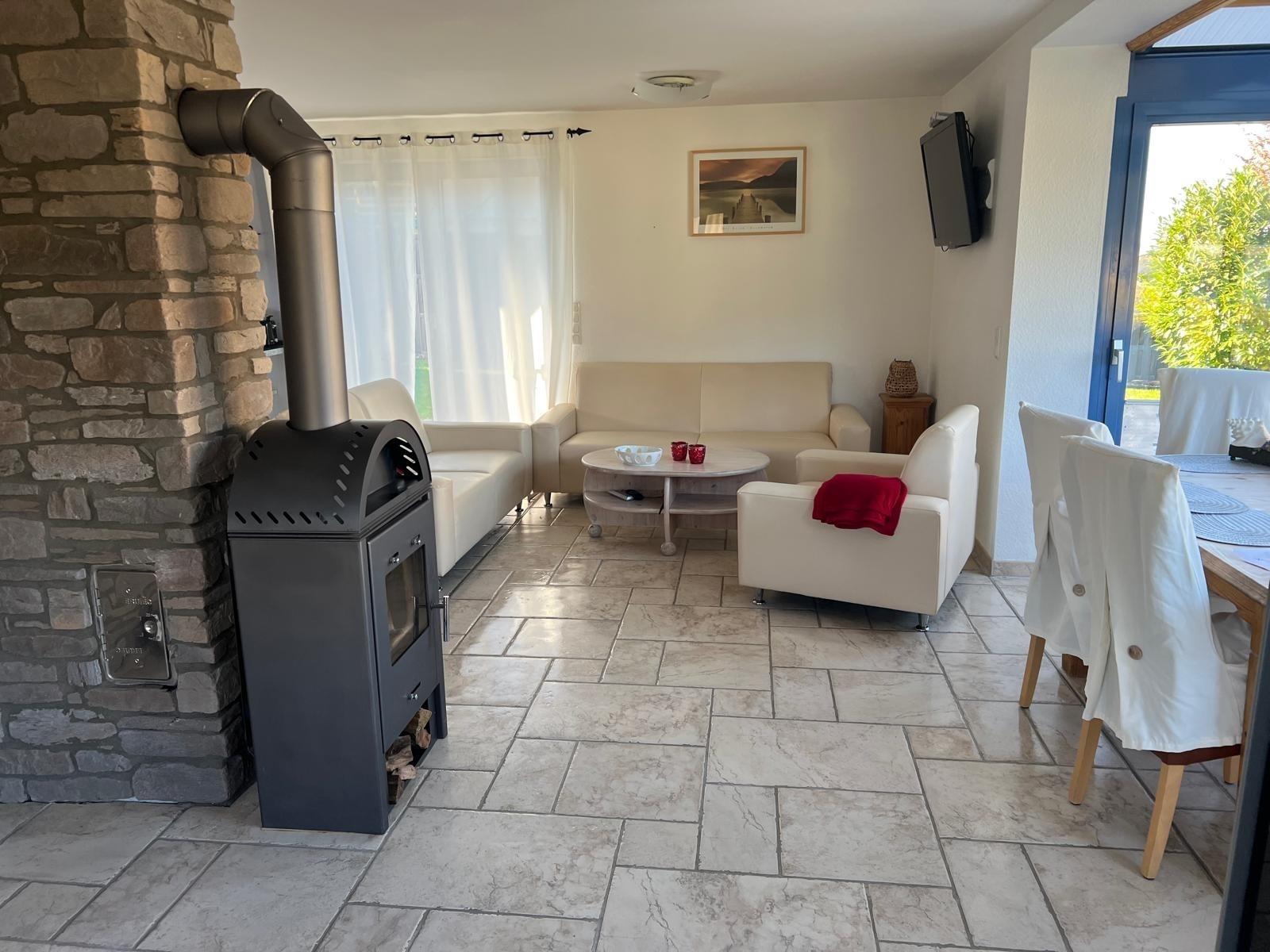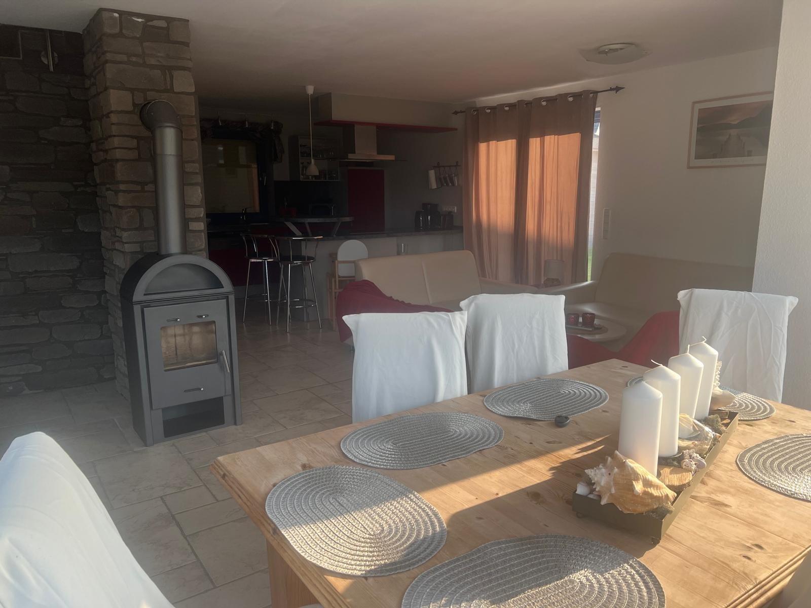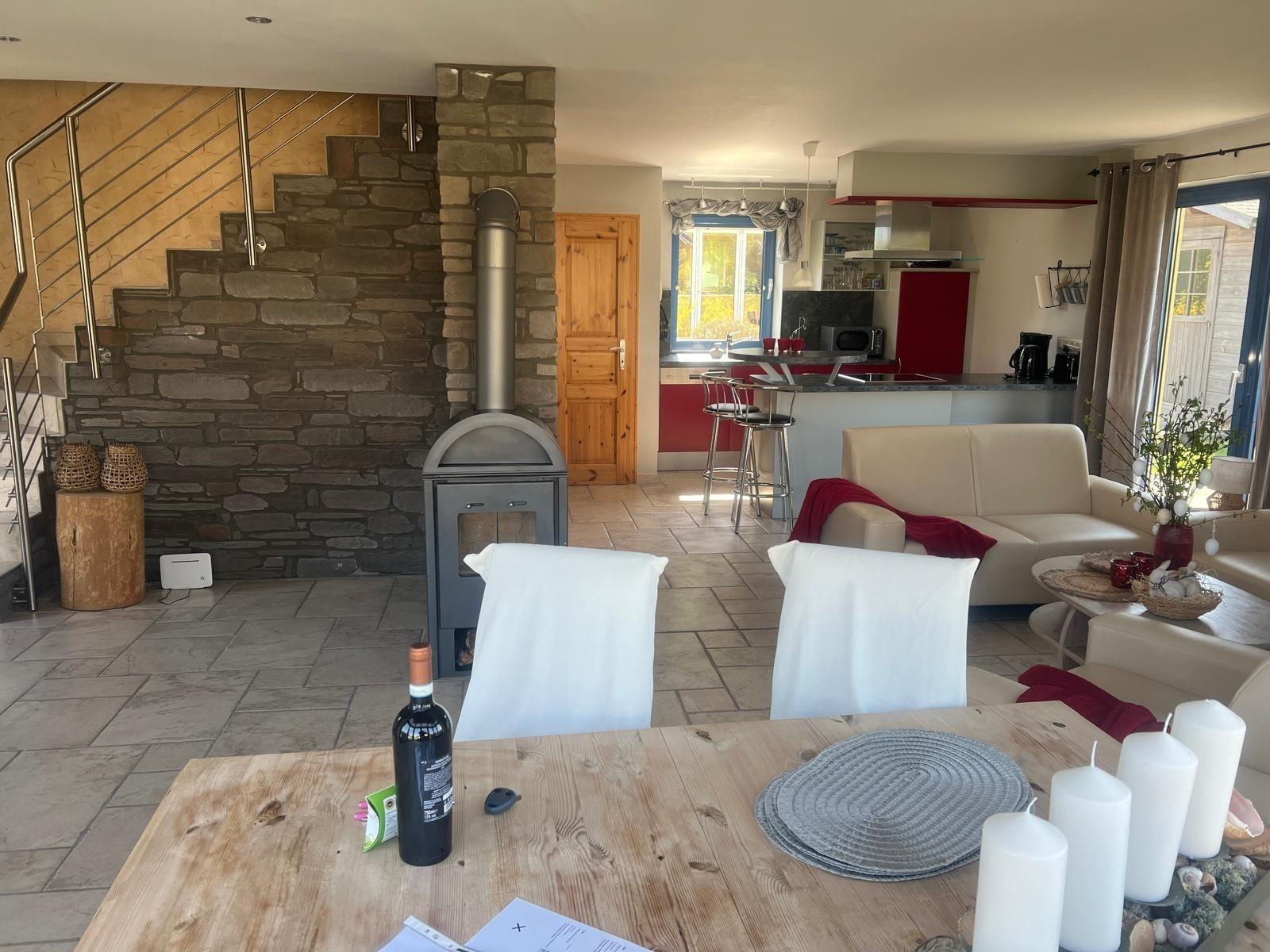 Die voll ausgestattete Küche ermöglicht gemeinsames Kochen. Neben dem Wohnbereich sorgt der Kaminofen für gemütliche Wärme an kühleren Tagen.
