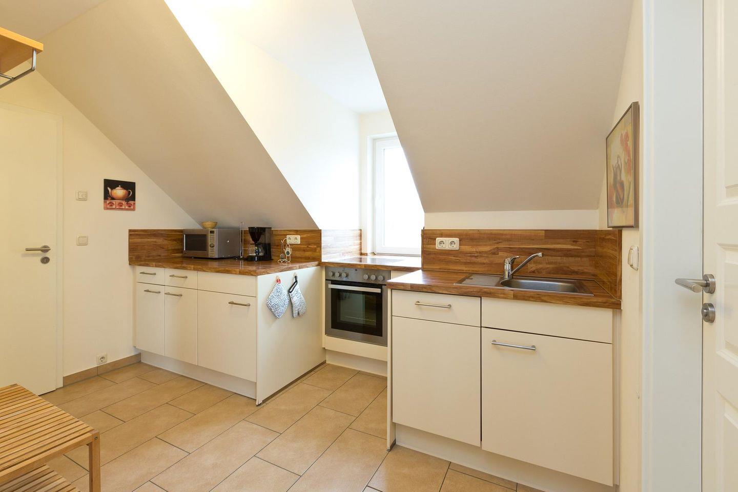 Die Ferienwohnung befindet sich im Obergeschoss der Villa Royal . Mit einem offenen Wohn - und Essbereich, sowie einer Küche, einem Bad und zwei Schlafzimmern. Sie bietet ausreichend Platz für 4 Personen. Im Erdgeschoss der Wohnung befindet sich der Wohn- und Essbereich, ein Badezimmer mit Sauna, Dusche und WC und ein Schlafzimmer mit Doppeltbett und Kleiderschrank. Die voll ausgestattete Küche bietet zahlreiches Zubehör und Elektrogeräte. Der Wohnbereich ist mit einem gemütlichen 3-Sitzer Sofa, Sessel und einem Elektro-Kamin ausgestattet, der für gemütliche Abende sorgt .Über den Wohnbereich gelangen Sie auf den großzügigen möblierten Balkon.