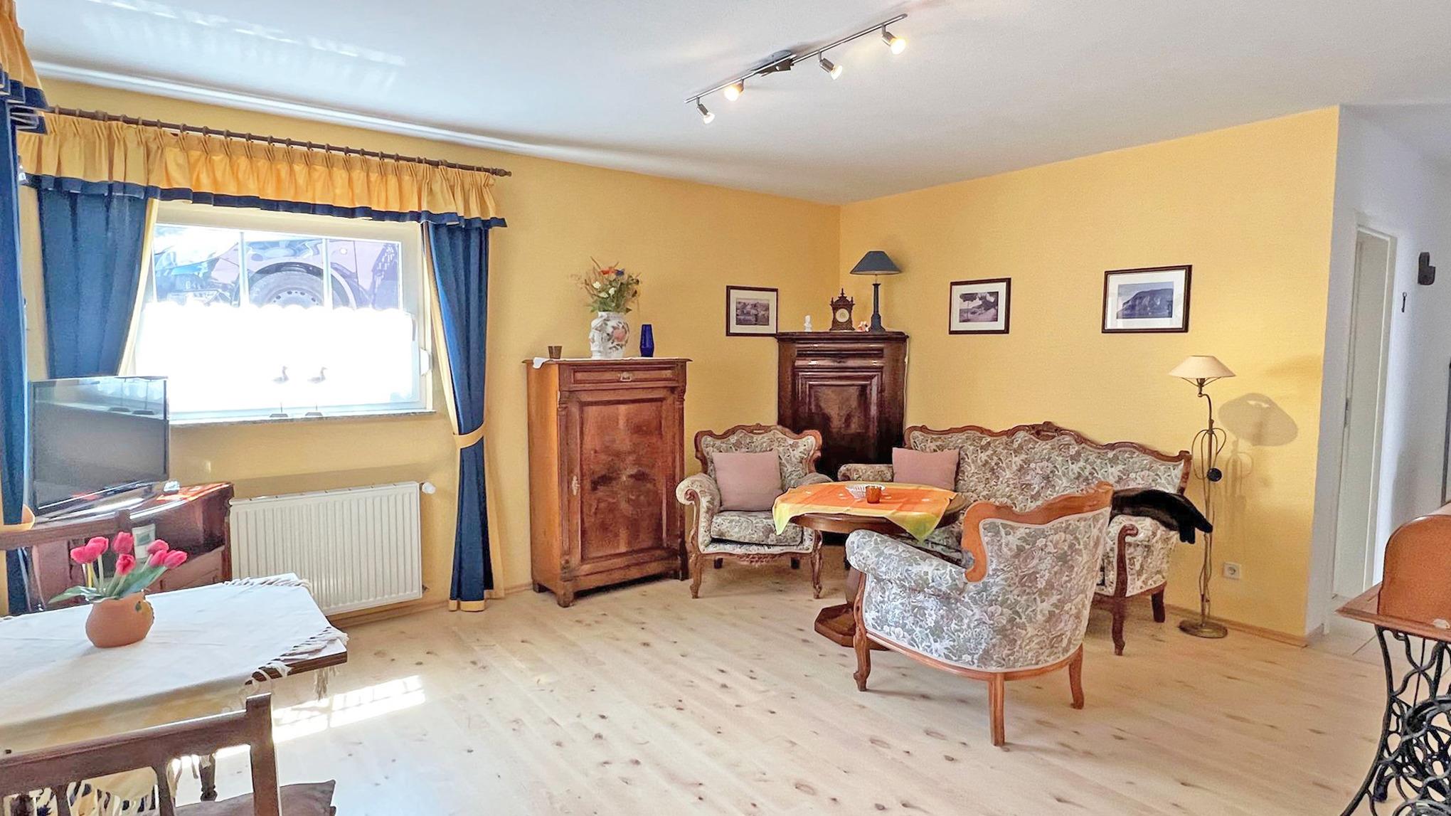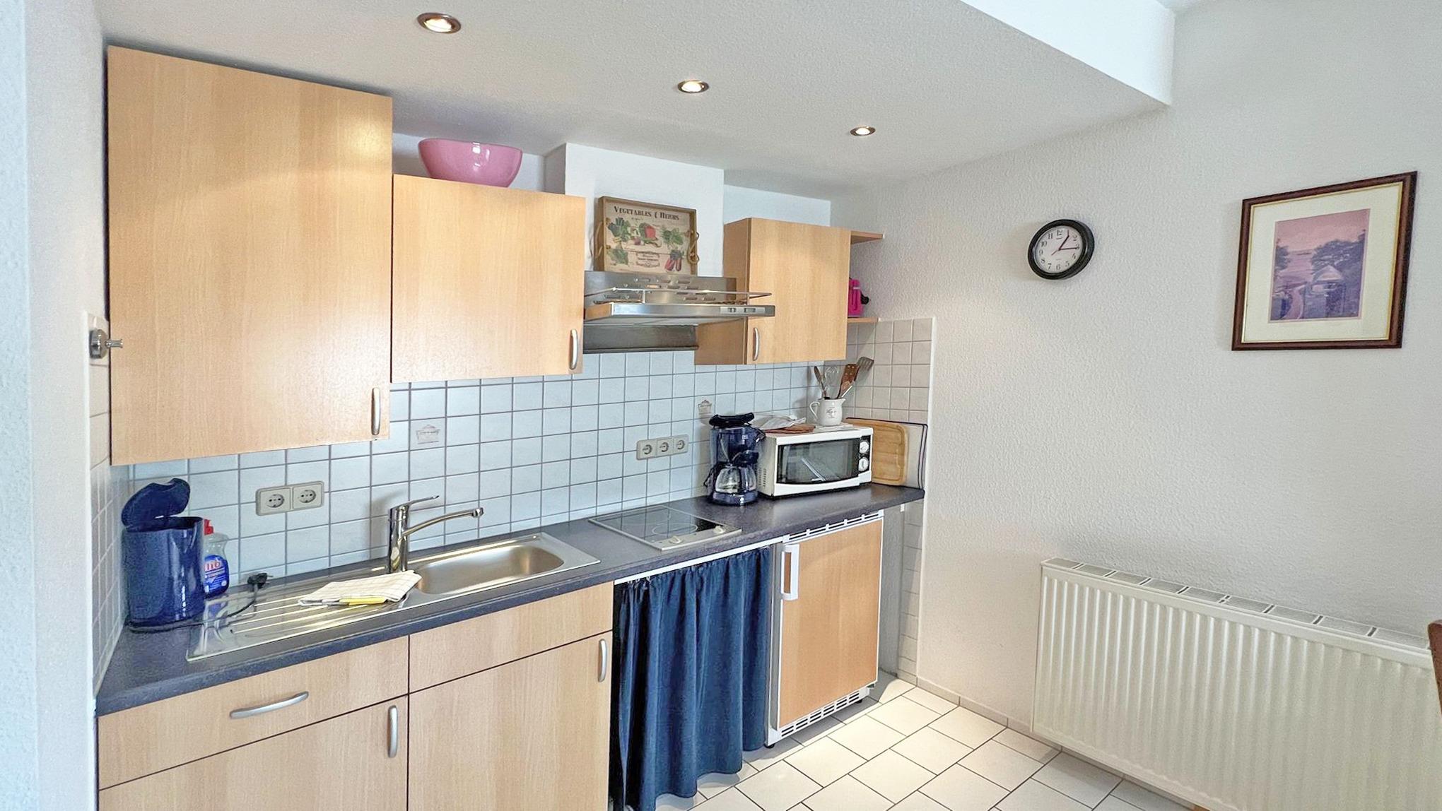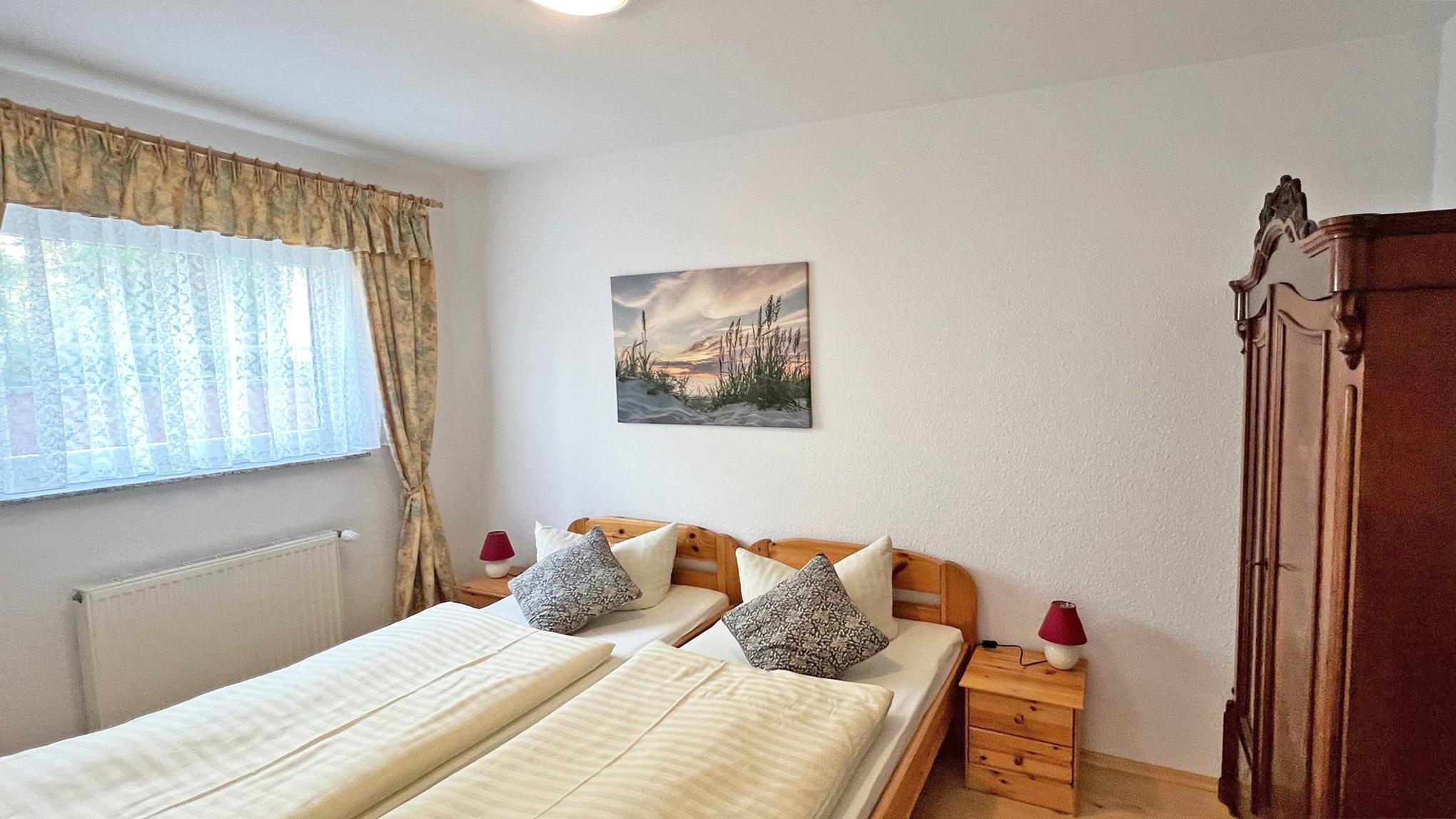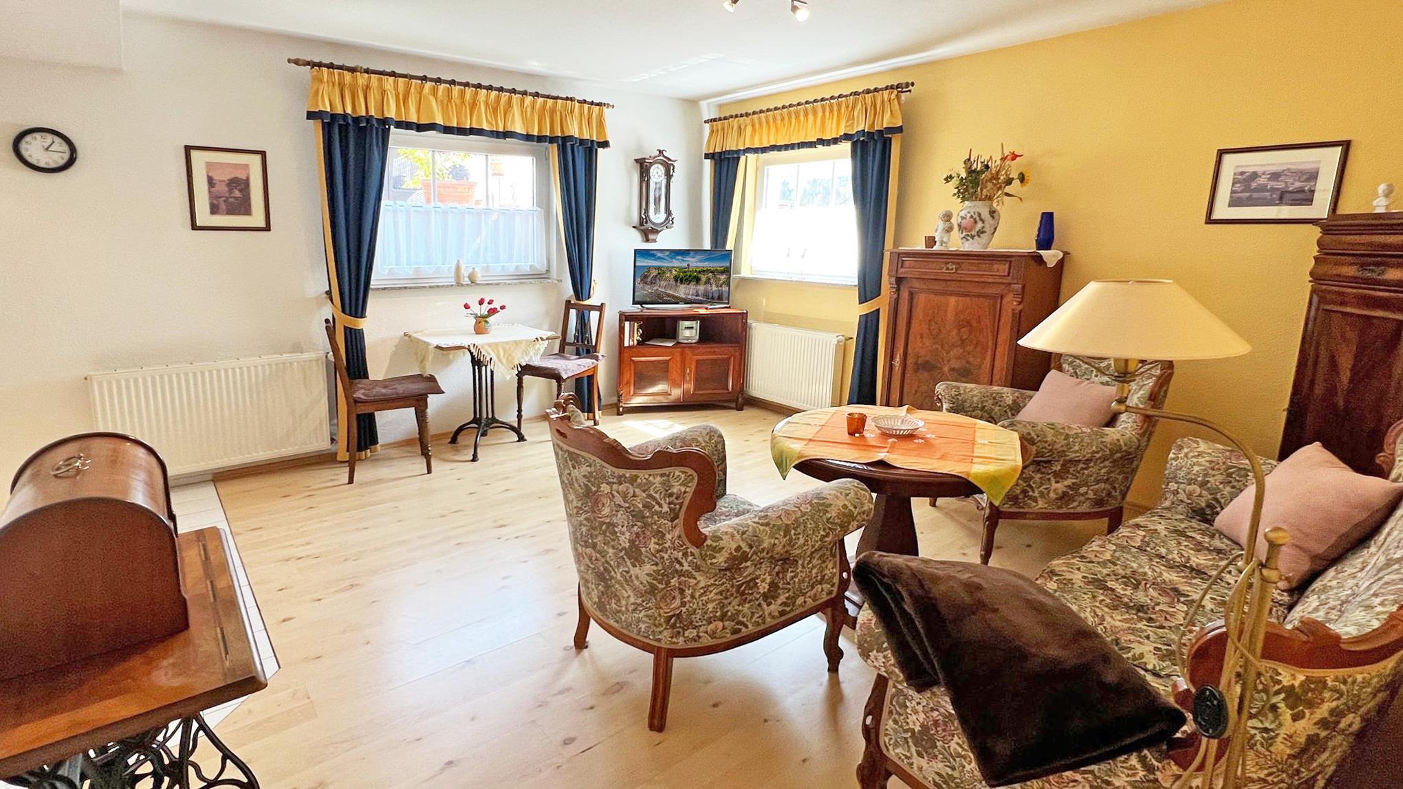 Die haustierfreie 39m²-Wohnung Nr. 4 liegt im Souterrain und besteht aus einem Wohnraum mit Flachbild-TV, Küchenzeile (Kaffeemaschine, Wasserkocher, Toaster, Eierkocher, Kühlschrank, Mikrowelle, E-Herd), einem Bad mit Dusche/WC, Haartrockner, einem separaten Schlafraum mit einem Doppelbett. Es erwartet Sie eine Terrasse vor dem Wohnhaus.