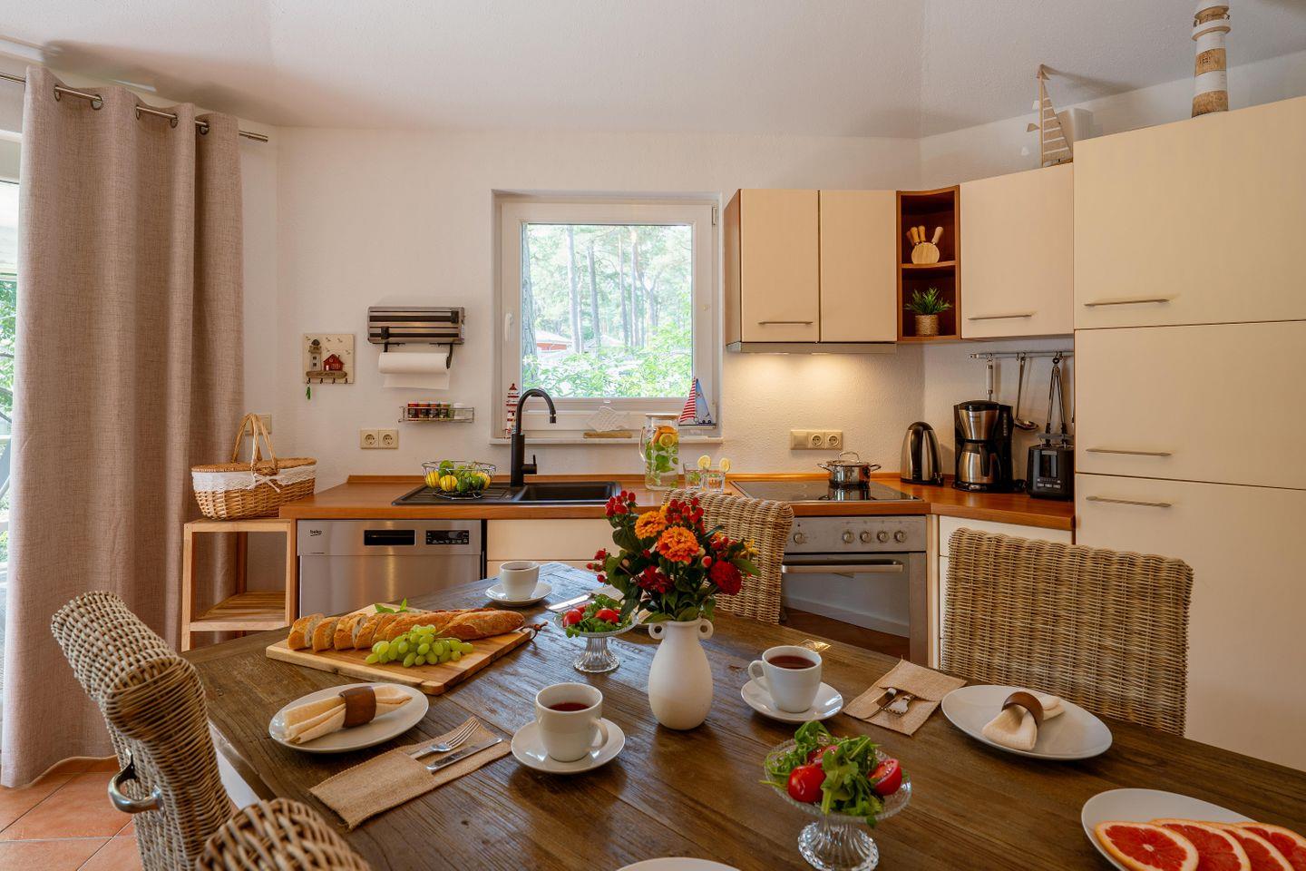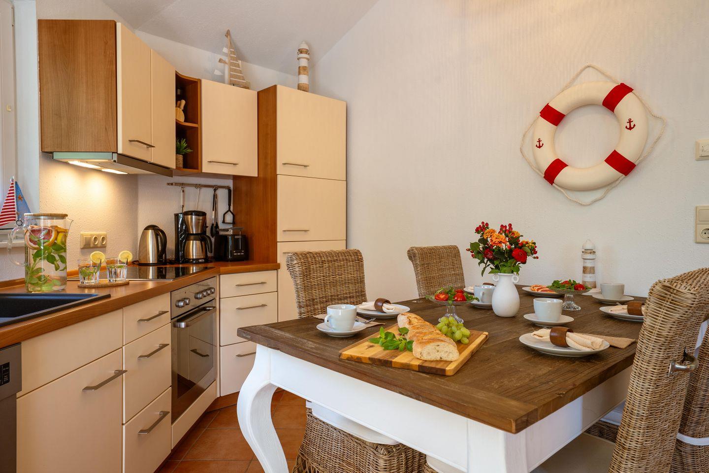KÜCHE // offene Küche, 4-Felder Ceranherd, Kühlschrank mit Gefrierfach, Backofen, Toaster, Wasserkocher, Kaffeemaschine, reichlich Besteck, Geschirr und Küchenutensilien ++