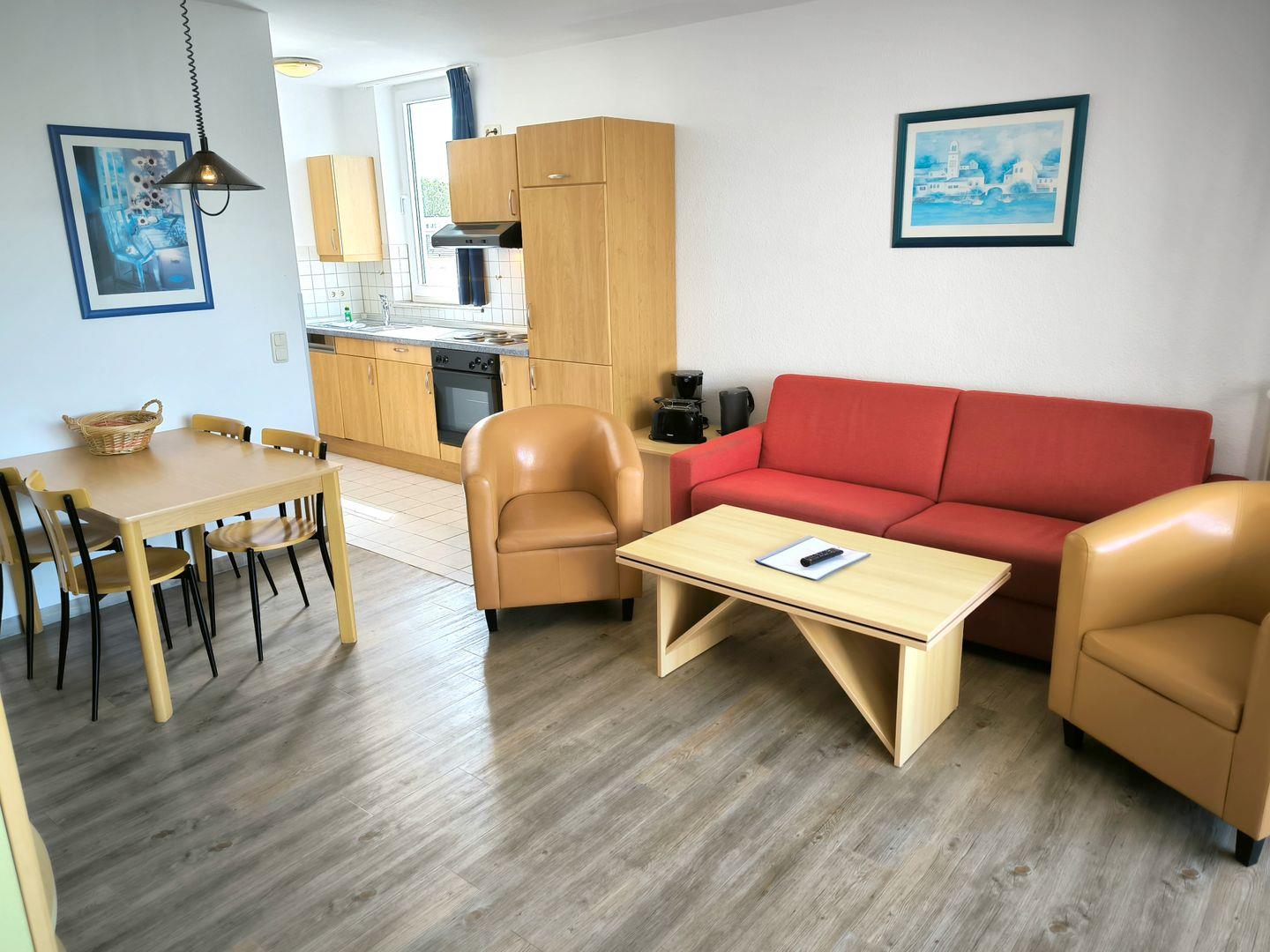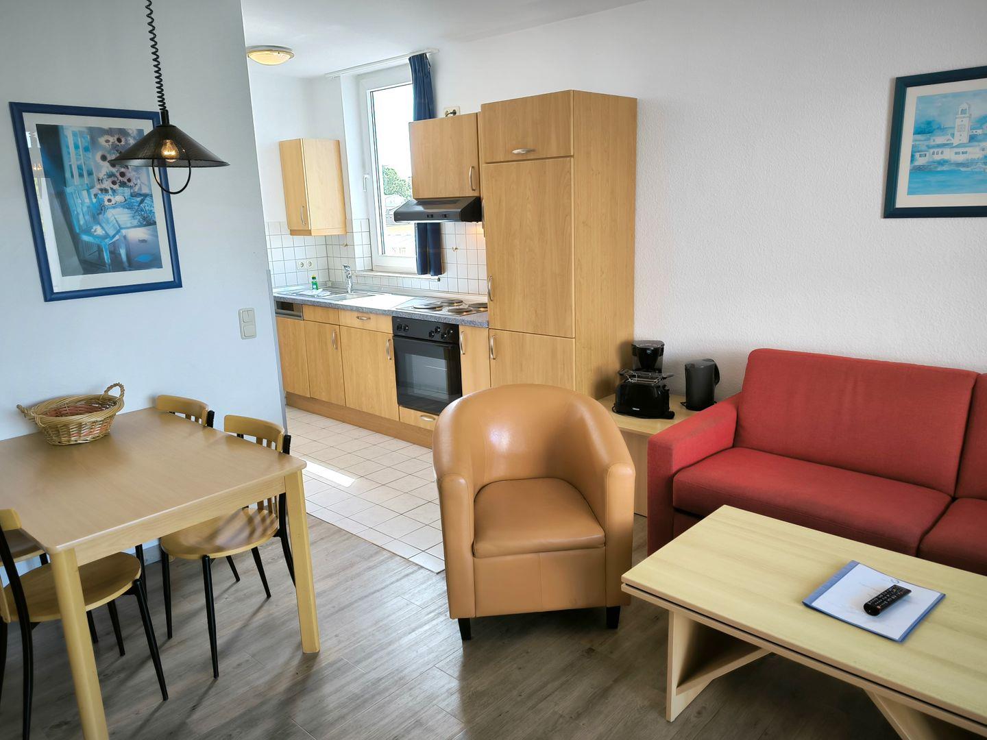 Die Wohnung verfügt über ein Schlafzimmer, das für bis zu vier Personen Schlafmöglichkeiten bietet, und mit einem modernen Sofa im Wohnzimmer auch zusätzliche Übernachtungsmöglichkeiten schafft. Das offene Küchendesign zum Wohnzimmer fördert eine gesellige Atmosphäre und ist voll ausgestattet. Sie finden hier eine Vielzahl von Küchengeräten, inklusive eines 4-Platten-Herdes, eines Backofens, einer Spülmaschine sowie einer Kaffeemaschine, um nur einige zu nennen. Geschirr, Besteck und Küchenutensilien sind ebenfalls vorhanden, sodass Sie sich wie zu Hause fühlen können.