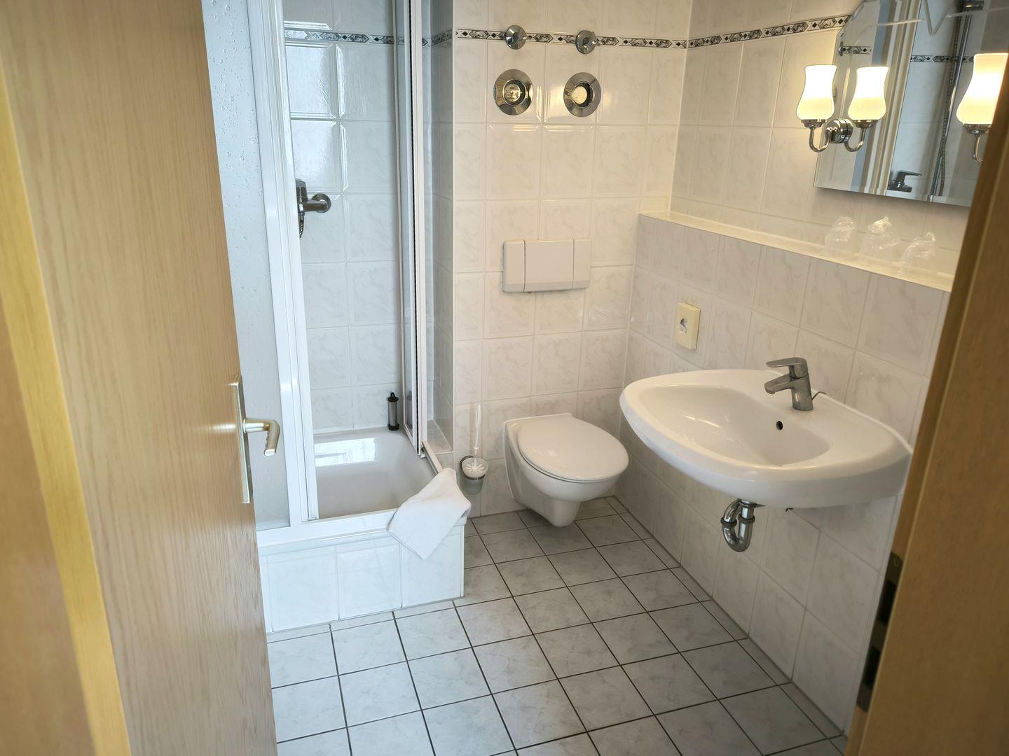 Das Badezimmer ist mit einer Dusche, einem WC und einem Waschbecken ausgestattete. Hier sorgt ein warmes Wasseranschluss für zusätzlichen Komfort. Im Wohnzimmer lädt eine gemütliche Sofaecke mit einem Fernseher zum Entspannen und Verweilen ein. Zudem stehen Ihnen ein Esstisch und Sessel zur Verfügung, um gemeinsame Mahlzeiten oder gesellige Spieleabende zu genießen. WLAN-Internet ist in der gesamten Unterkunft verfügbar, damit Sie sich während Ihres Aufenthalts verbunden fühlen.