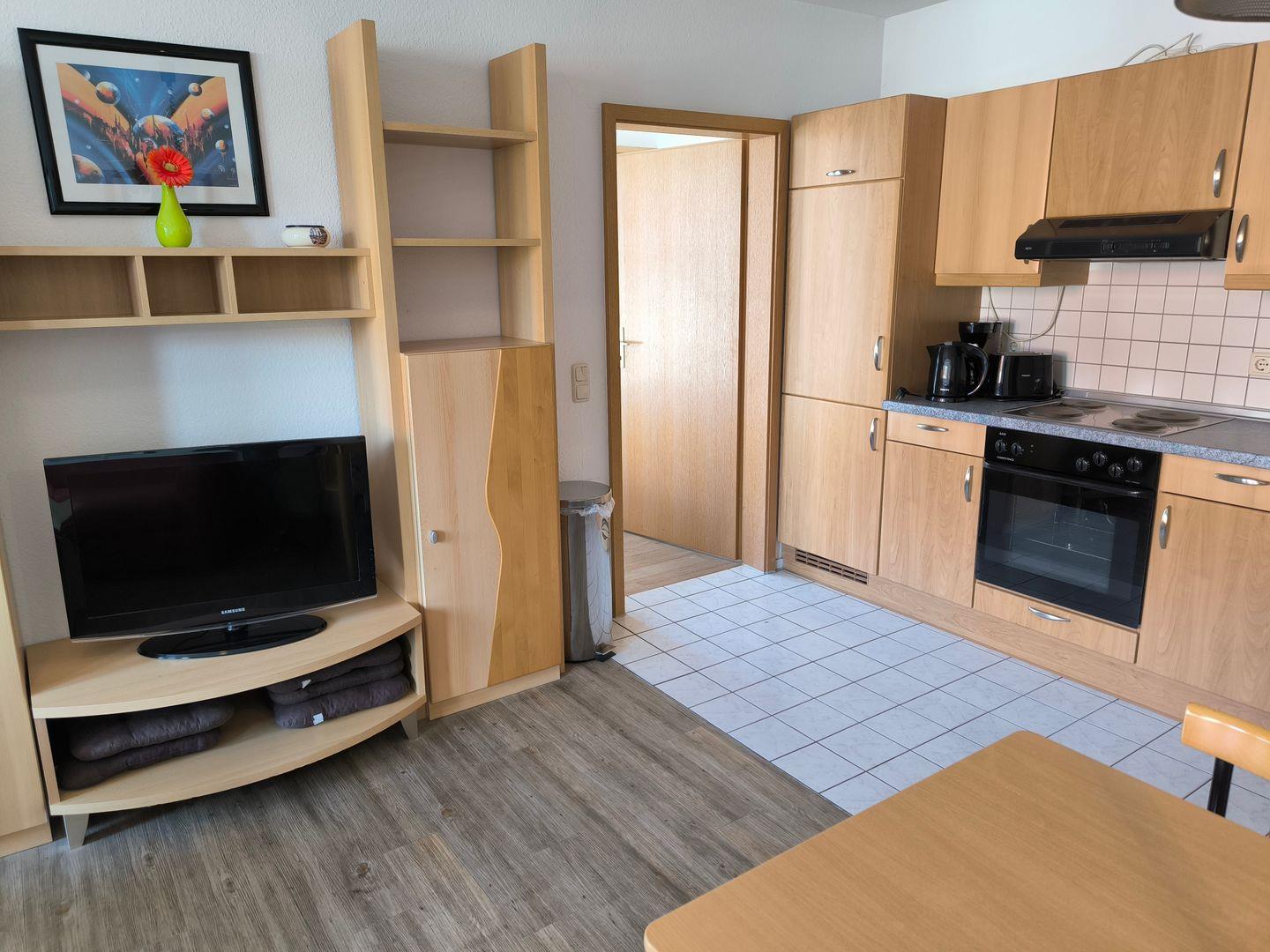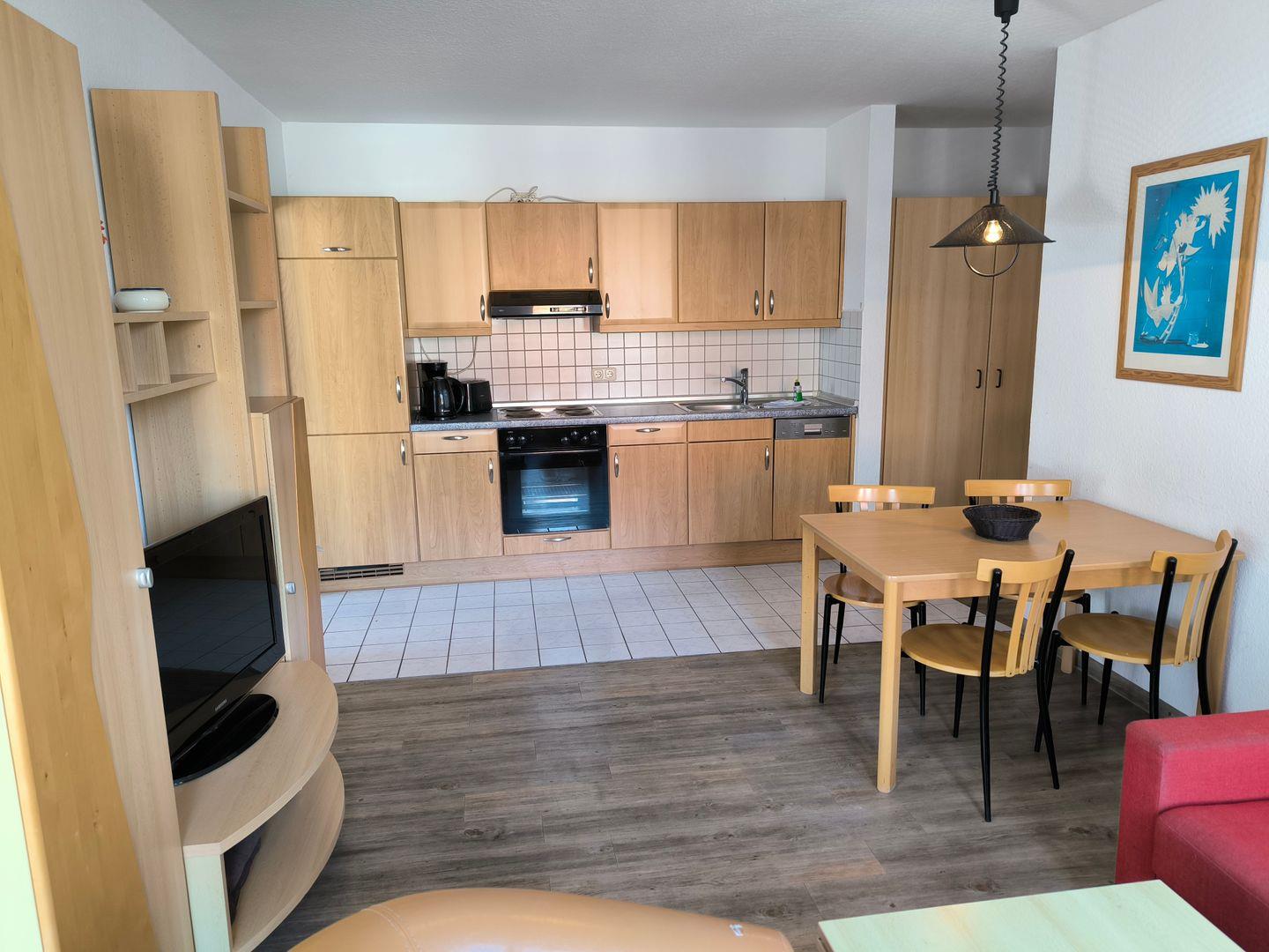 Im Wohnraum integrierte Einbauküche, ausgestattet mit: 4- Platten- Kochfeld, Backofen, Kühlschrank, Geschirrspüler, Toaster, Kaffeemaschine, Wasserkocher und Küchenutensilien