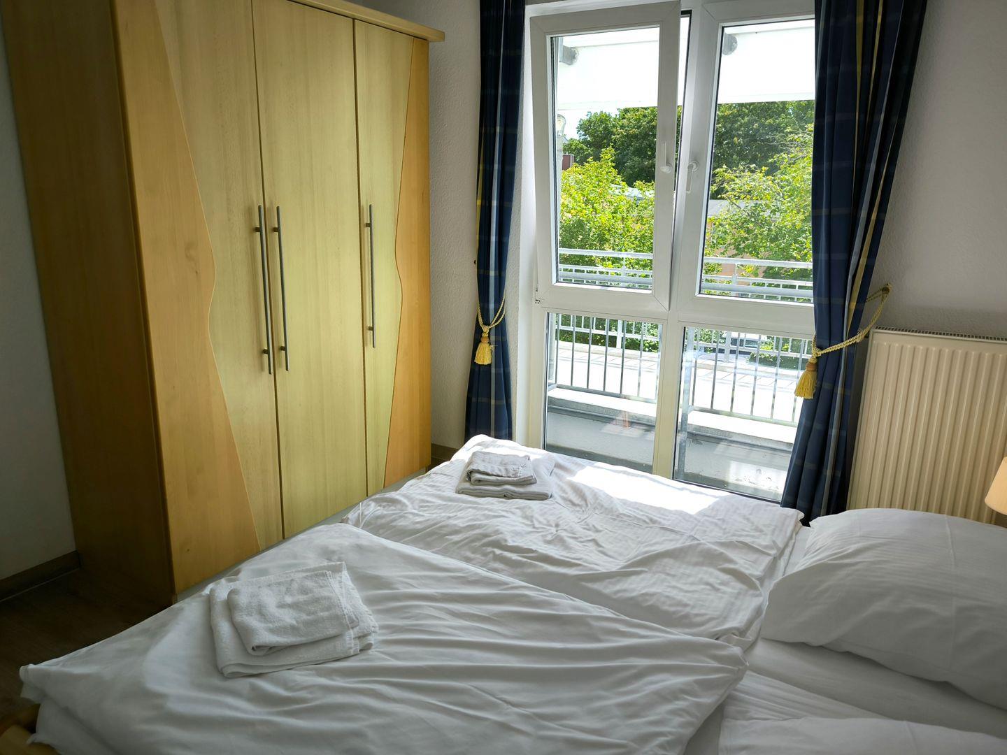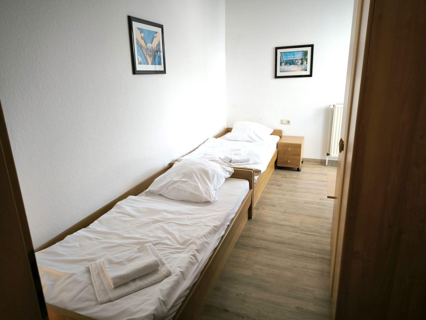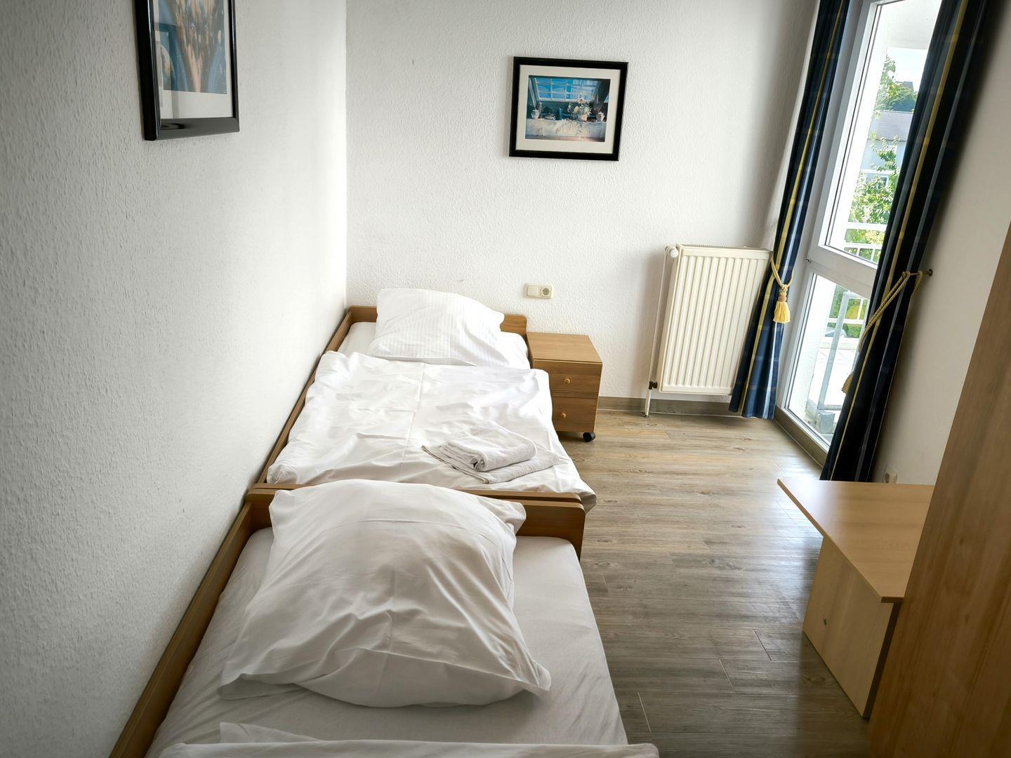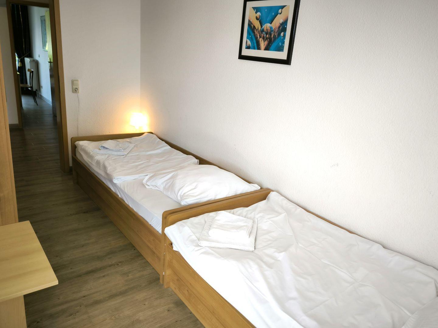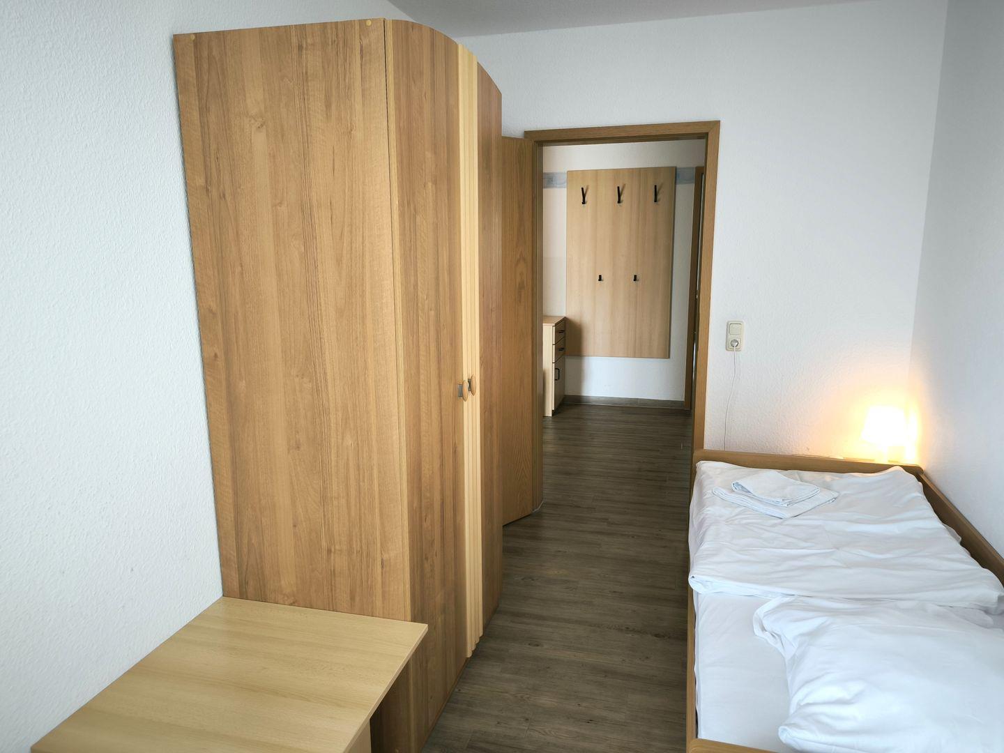 Schlafzimmer mit 2 Einzelbetten (90 x 200 cm ), großem Kleiderschrank, Tisch und Stühlen