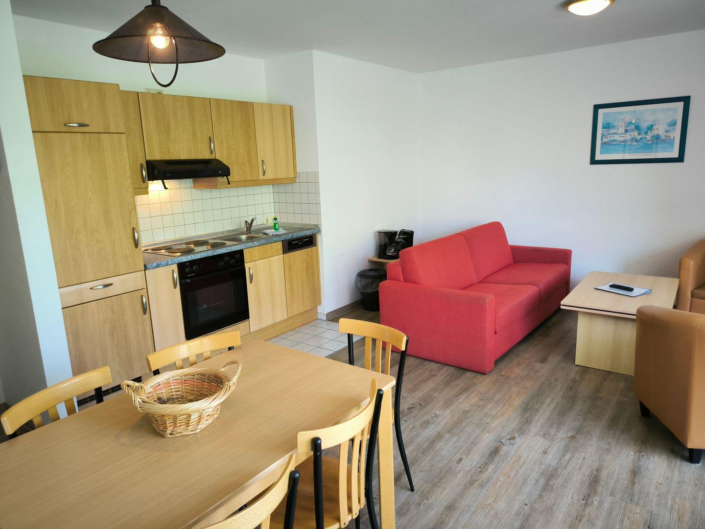 Im Wohnraum integrierte Einbauküche, ausgestattet mit: 4- Platten- Kochfeld, Backofen, Kühlschrank, Geschirrspüler, Toaster, Kaffeemaschine, Wasserkocher und Küchenutensilien