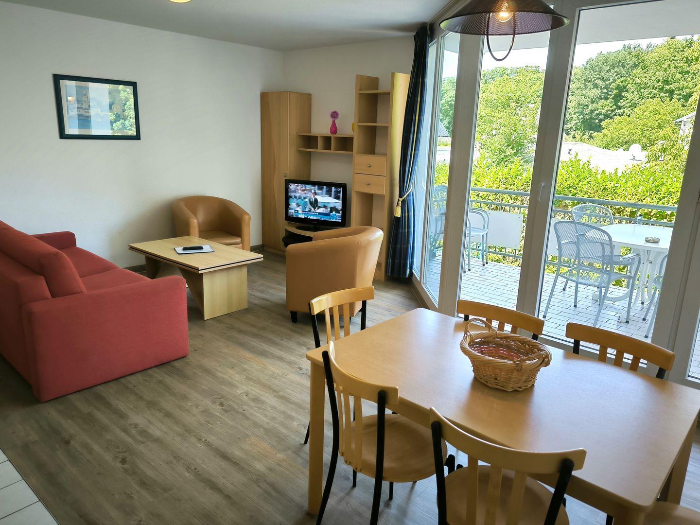 Wohnbereich mit moderner Wohnlandschaft, Couchtisch, Anrichte mit Flat-TV (integr. Radiofunktion) und Esstisch mit 4 Stühlen