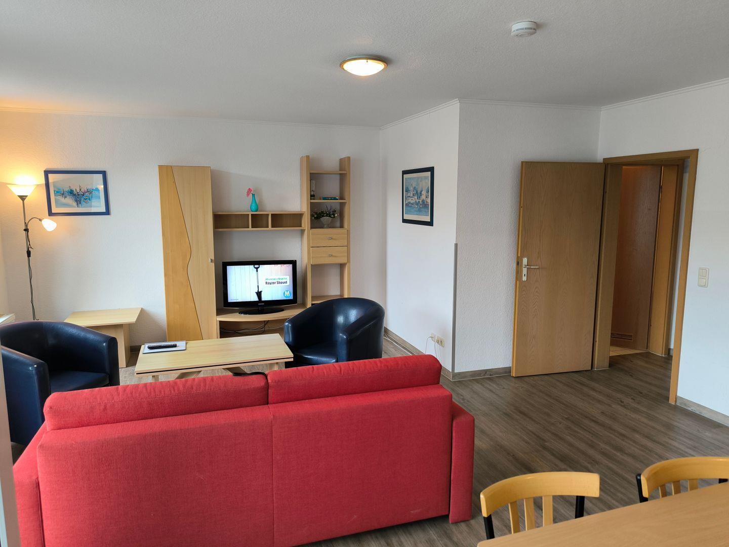 Wohnbereich mit moderner Wohnlandschaft, Couchtisch, Anrichte mit Flat-TV (integr. Radiofunktion) und Esstisch mit 4 Stühlen
