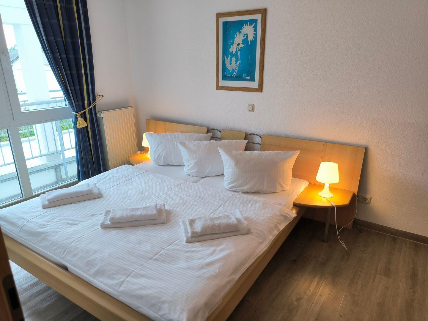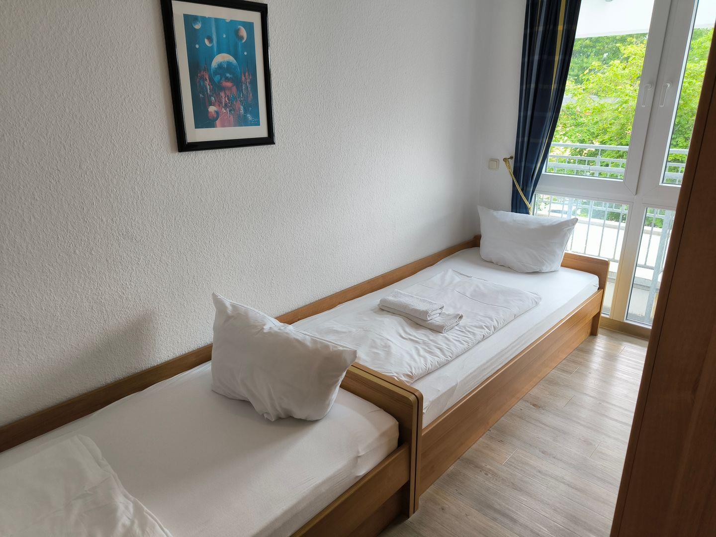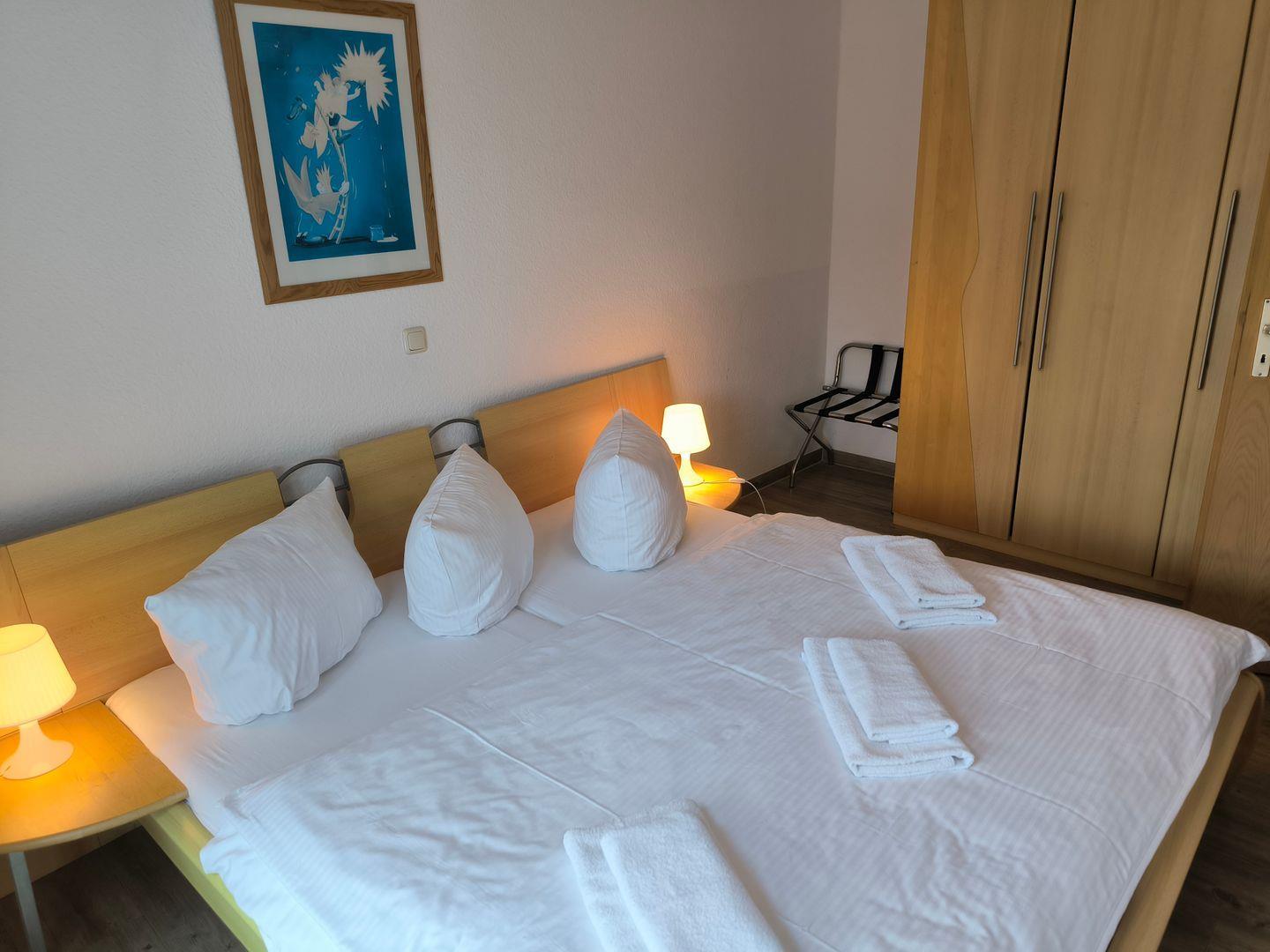 Schlafzimmer mit 2 Einzelbetten (90 x 200 cm ), großem Kleiderschrank, Tisch und Stühlen