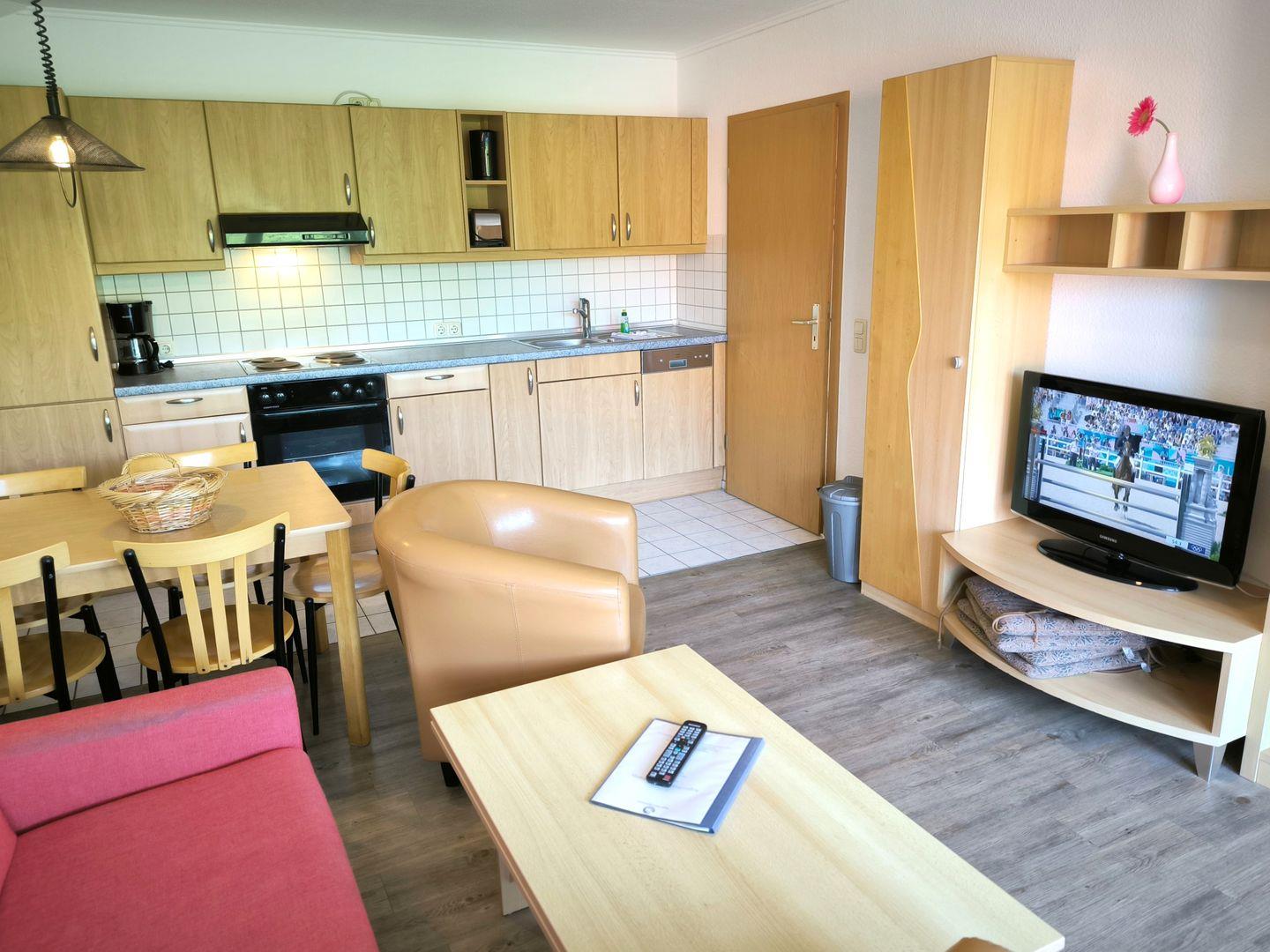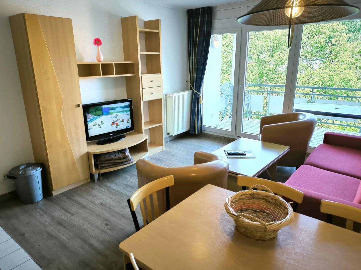 Wohnbereich mit moderner Wohnlandschaft, Couchtisch, Anrichte mit Flat-TV (integr. Radiofunktion) und Esstisch mit 4 Stühlen