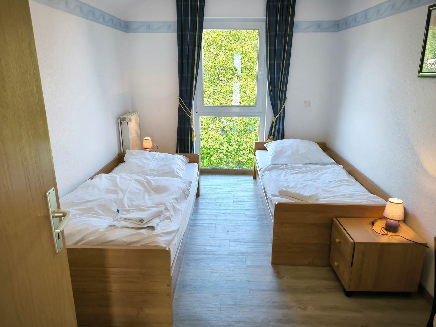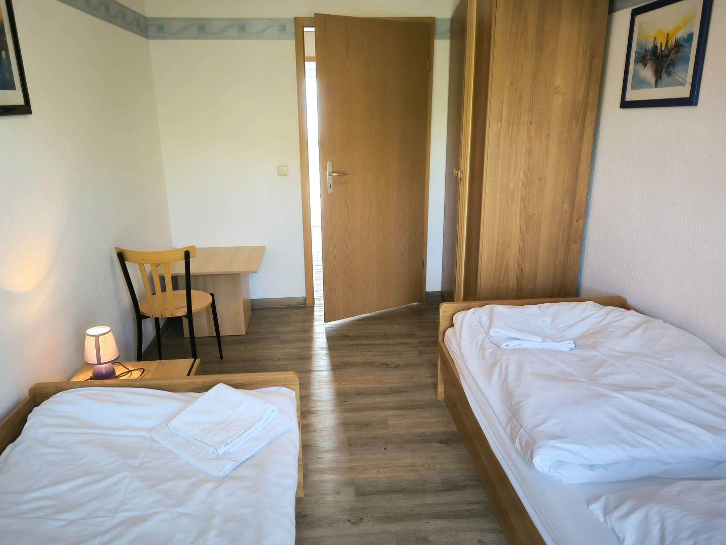 Schlafzimmer mit 2 Einzelbetten (90 x 200 cm ), großem Kleiderschrank, Tisch und Stühlen
