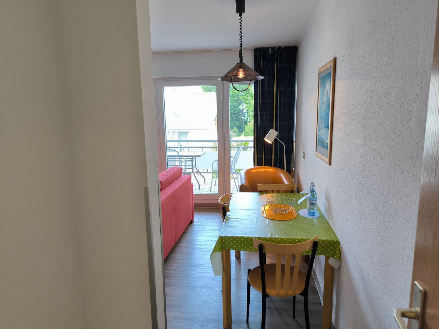 Wohnbereich mit ausziehbarer Doppelbettschlafcouch (170 x 200 cm), 2 Sesseln, Couchtisch, TV mit Radiofunktion und Esstisch mit 4 Stühlen