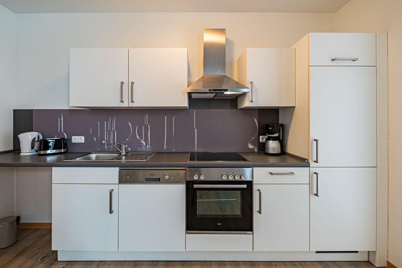 Im Wohnraum integrierte Einbauküche, ausgestattet mit: 4-Platten-Kochfeld, Backofen, Dunstabzugshaube, Kühlschrank ohne Gefrierfach, Geschirrspüler, Toaster, Kaffeemaschine, Wasserkocher und Küchenutensilien