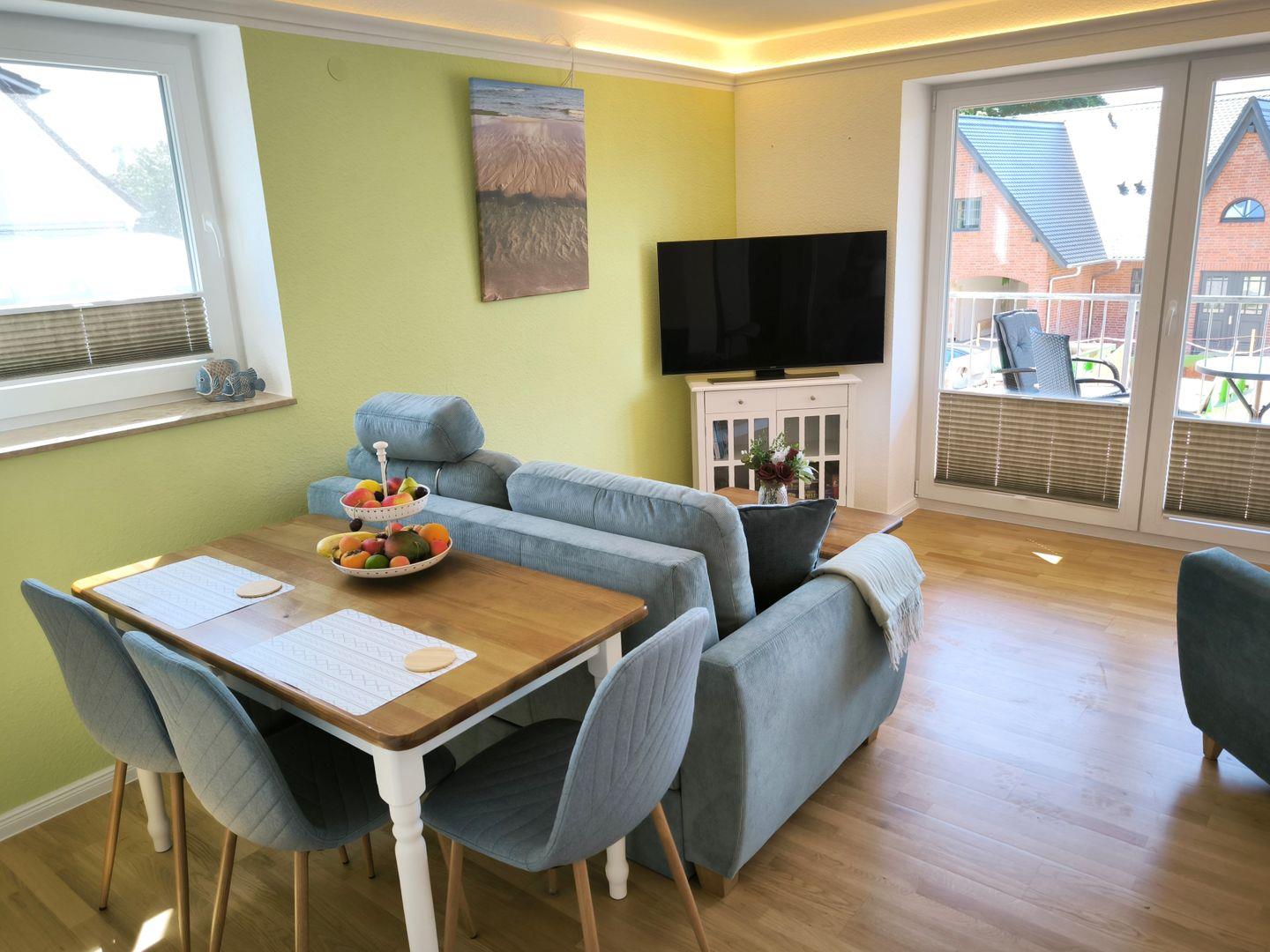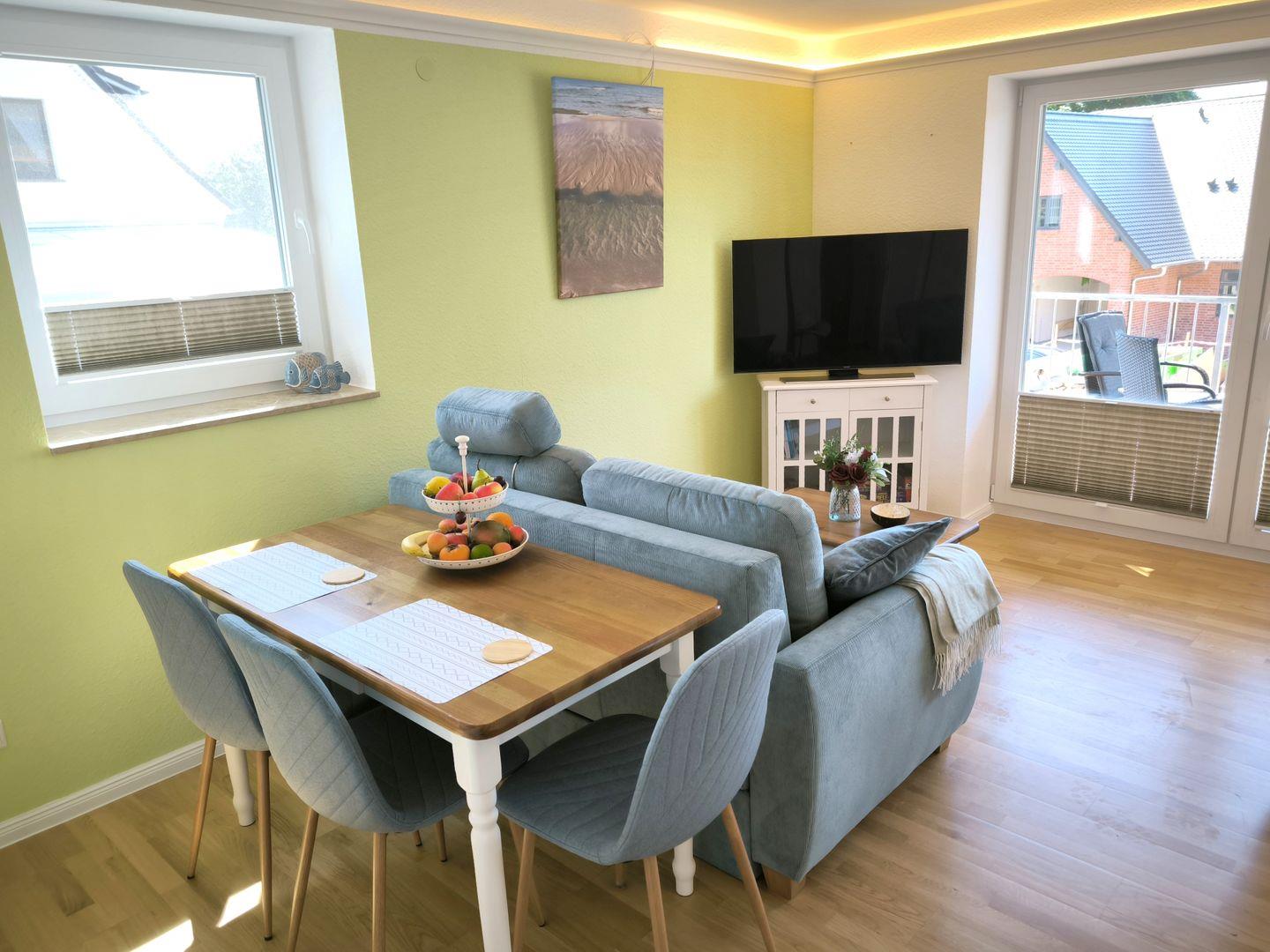 Wohnbereich mit Schlafsofa, Sessel und Couchtisch, 48?-UHD-Smart-TV mit Netflix, Esstisch mit 3 Stühlen