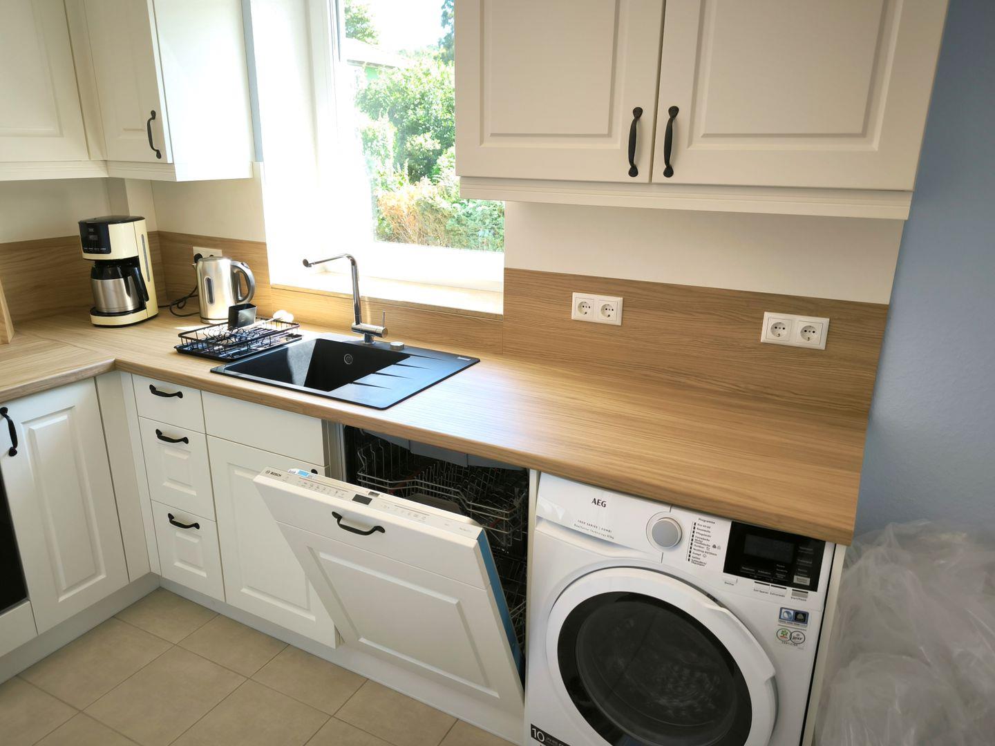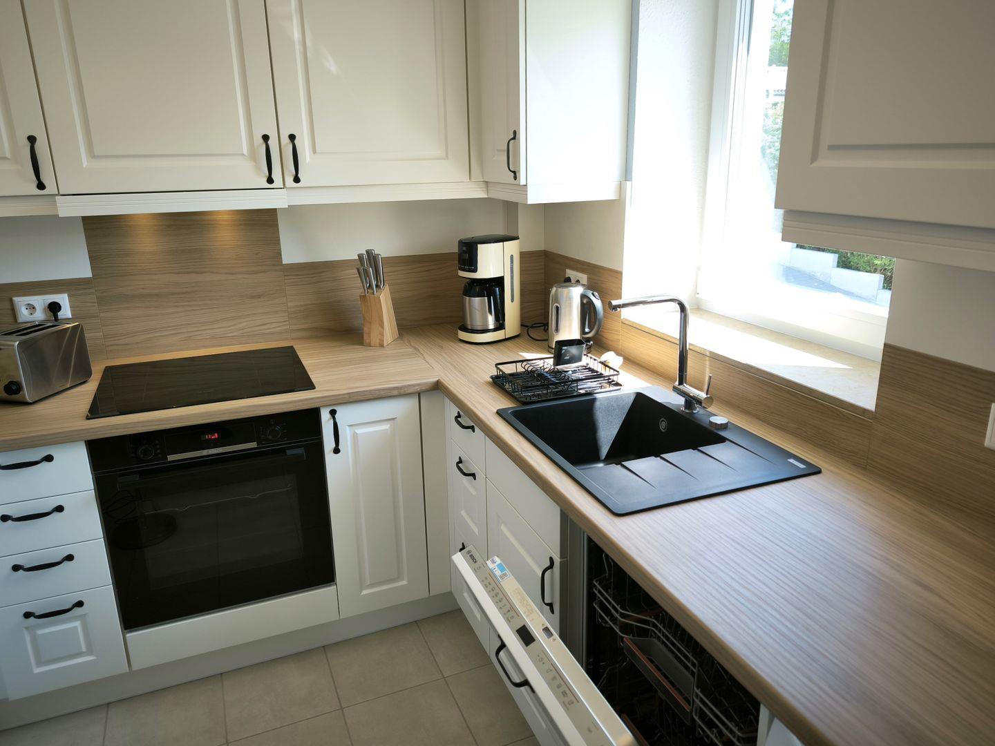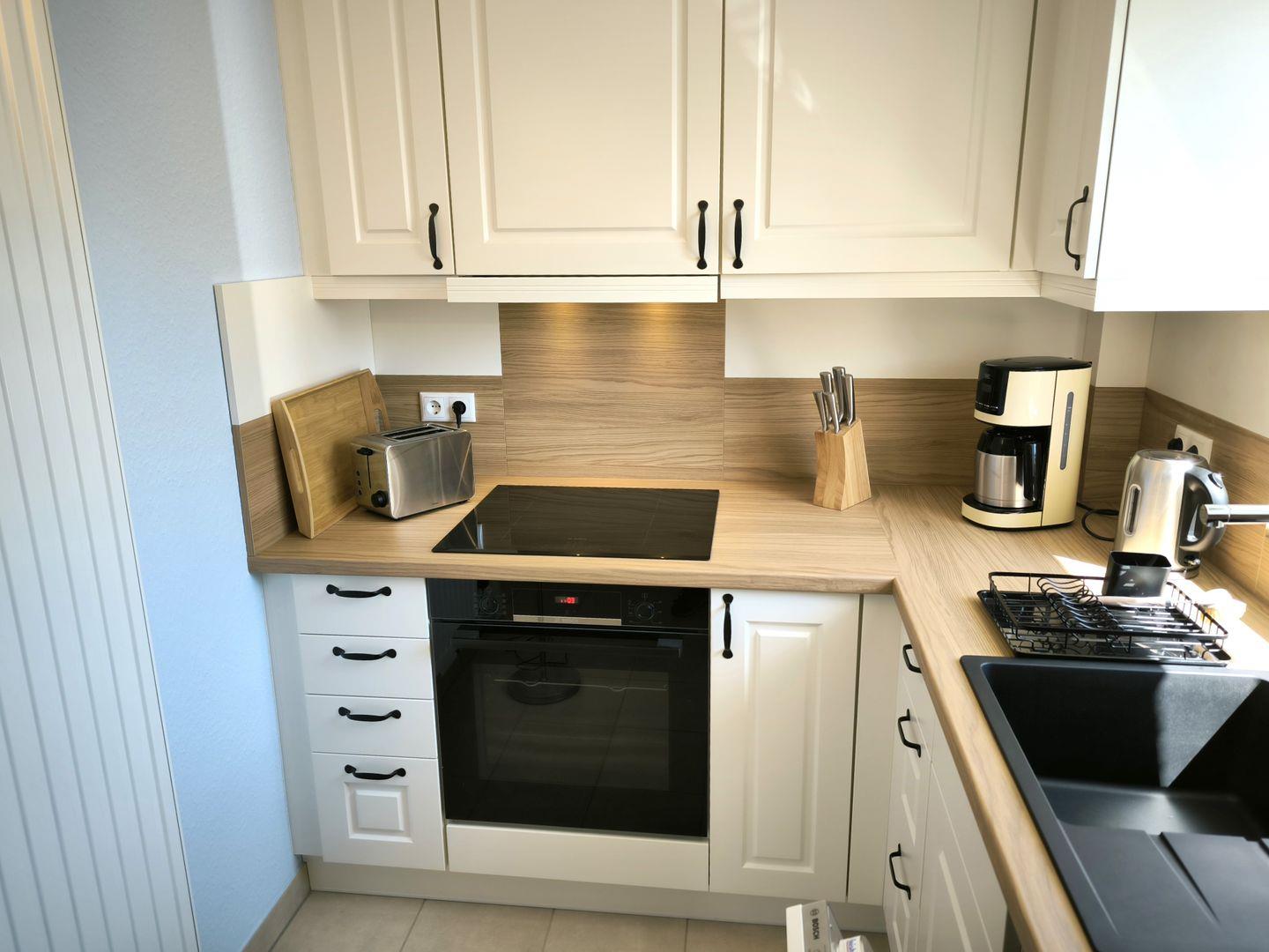 separate Küche mit Induktionskochfeld, Backofen, großer Kühl- Gefrierkombination, Geschirrspüler, Toaster, Kaffeemaschine, Wasserkocher und hochwertigen Küchenutensilien sowie einem Waschtrockner