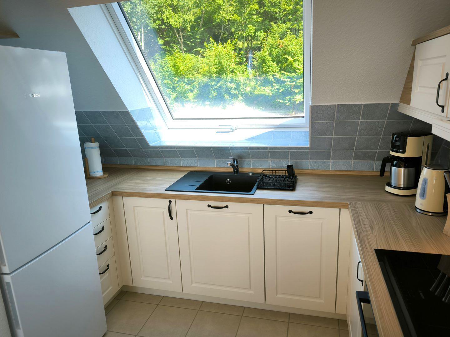 moderne Einbauküche durch einen Vorhang vom Wohnraum getrennt, mit Induktionskochfeld, Backofen, großer Kühl- Gefrierkombination, Geschirrspüler, Toaster, Kaffeemaschine, Wasserkocher und hochwertigen Küchenutensilien