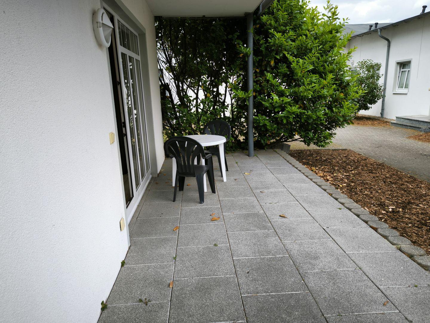 Terrasse mit Gartentisch und Stühlen