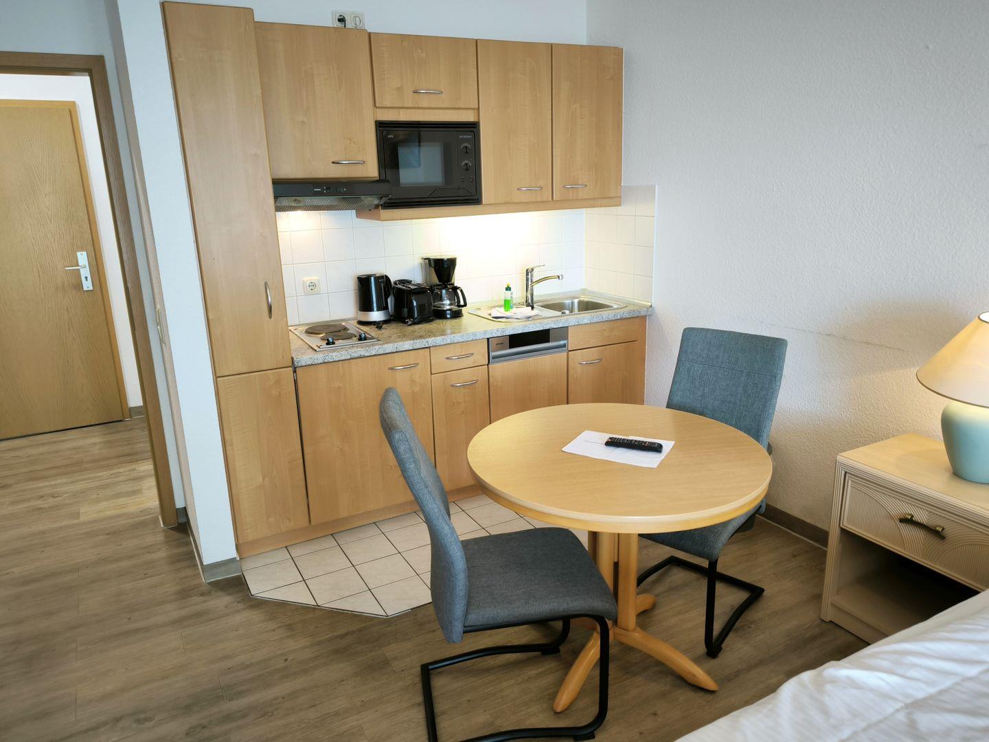 in den Wohnraum integrierte Einbauküche, ausgestattet mit 2-Platten-Kochfeld, Mikrowelle, Dunstabzugshaube, Kühlschrank mit Gefrierfach, Geschirrspüler, Toaster, Kaffeemaschine, Wasserkocher und Küchenutensilien