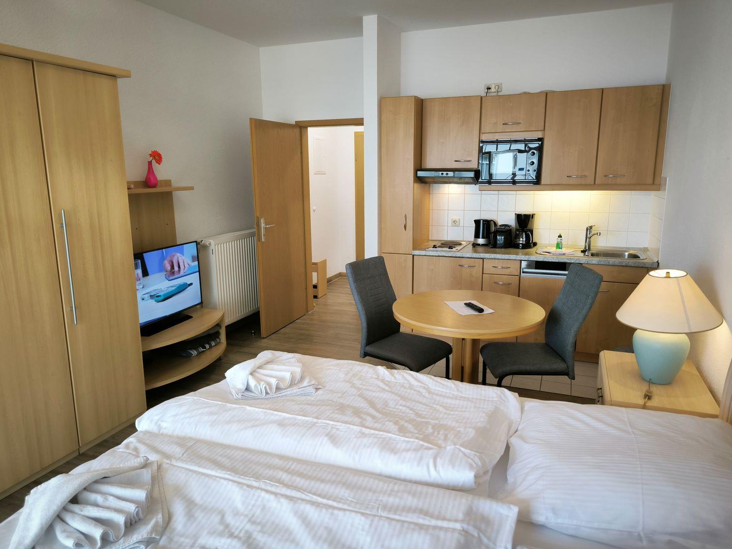 kombinierter Wohn- / Schlafraum mit Doppelbett (180 x 200 cm), Nachttischen, großem Kleiderschrank, Tisch mit 2 Ledersesseln, Anrichte mit TV, Kofferablage