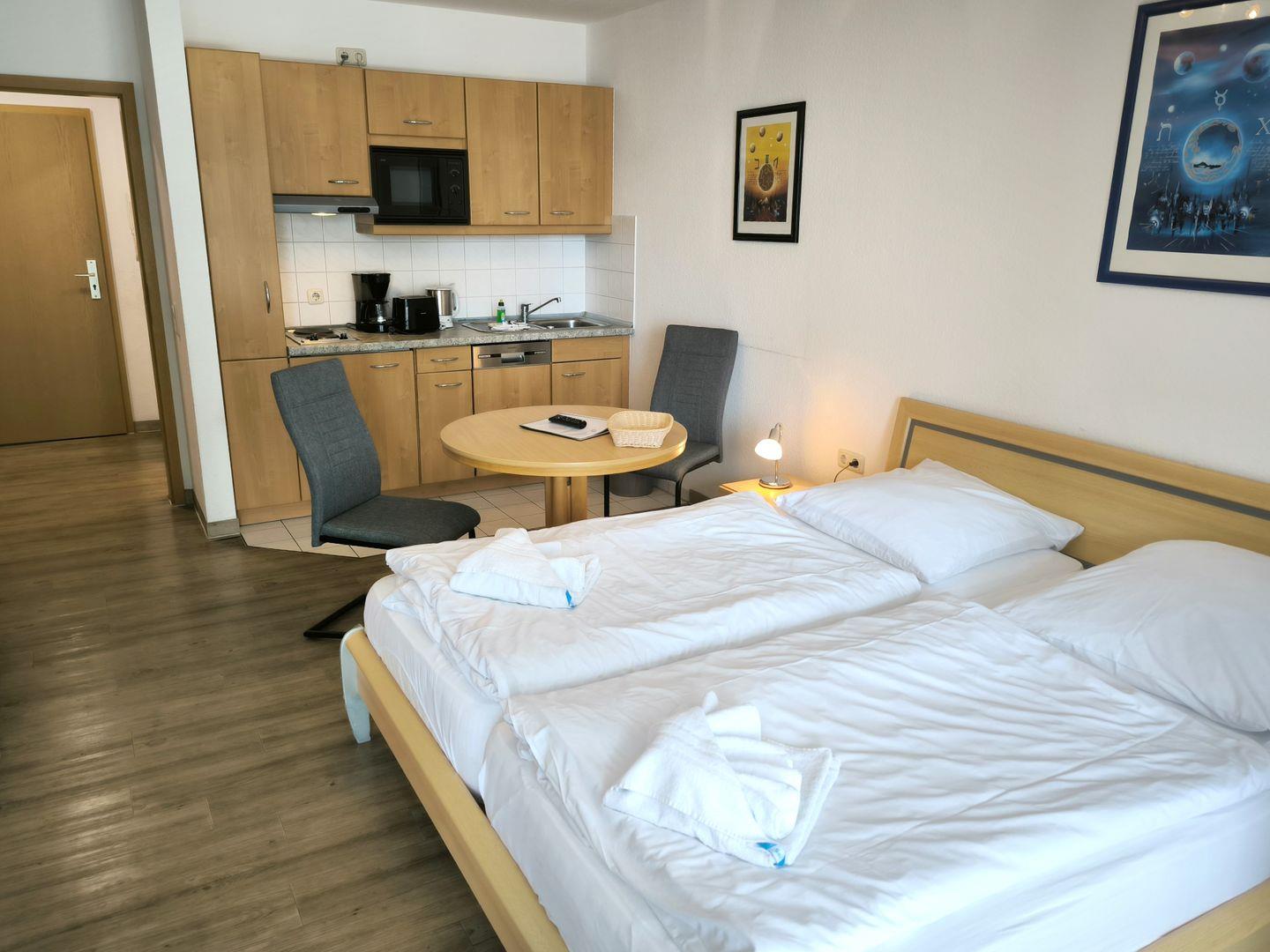 kombinierter Wohn-/Schlafraum mit Doppelbett (180 x 200 cm), Nachttischen, großem Kleiderschrank, Tisch mit 2 Ledersesseln, Anrichte mit TV, Kofferablage