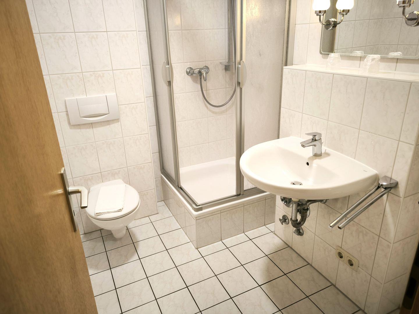Bad mit Dusche, WC, Föhn und beleuchtetem Kosmetikspiegel