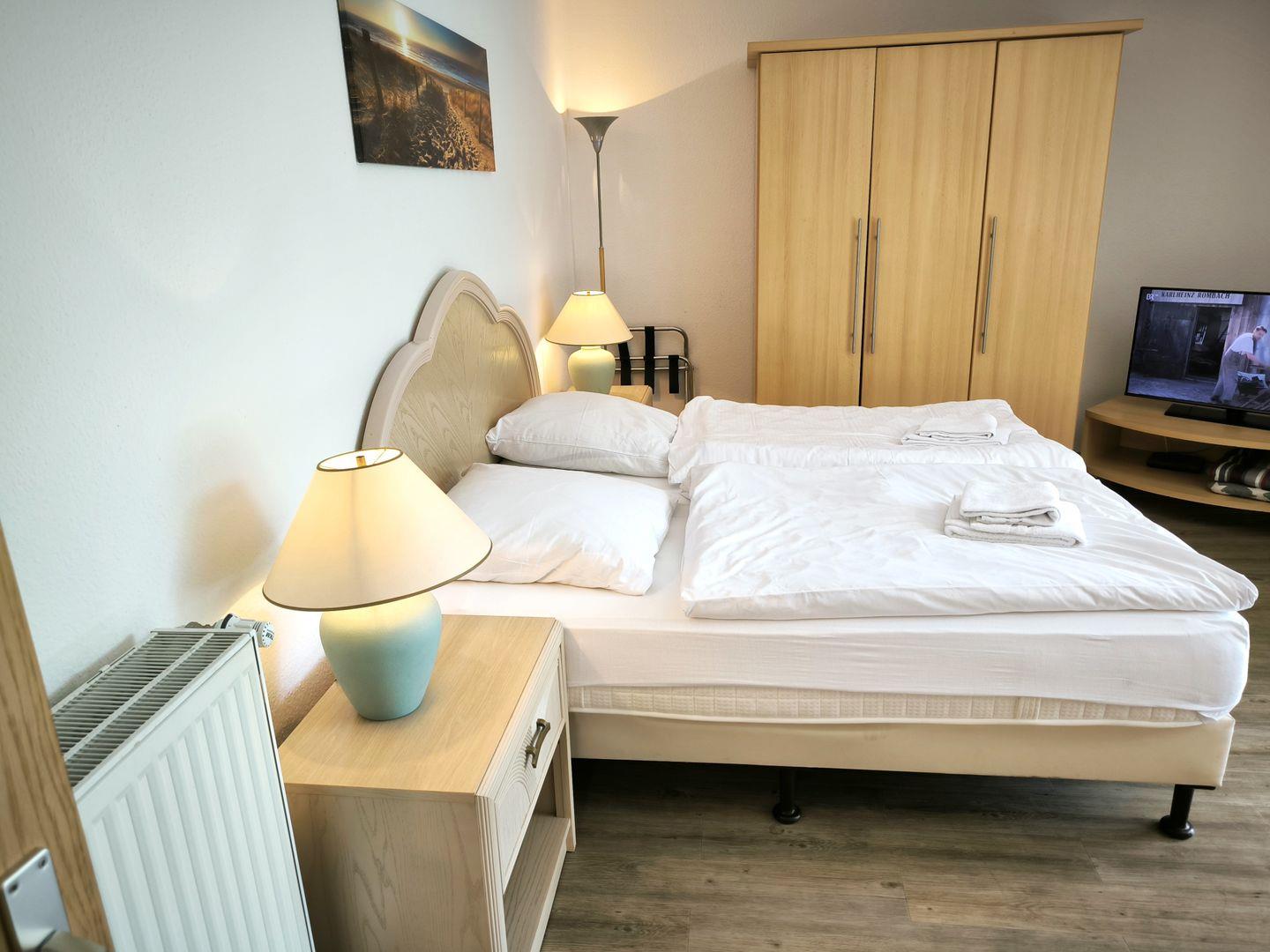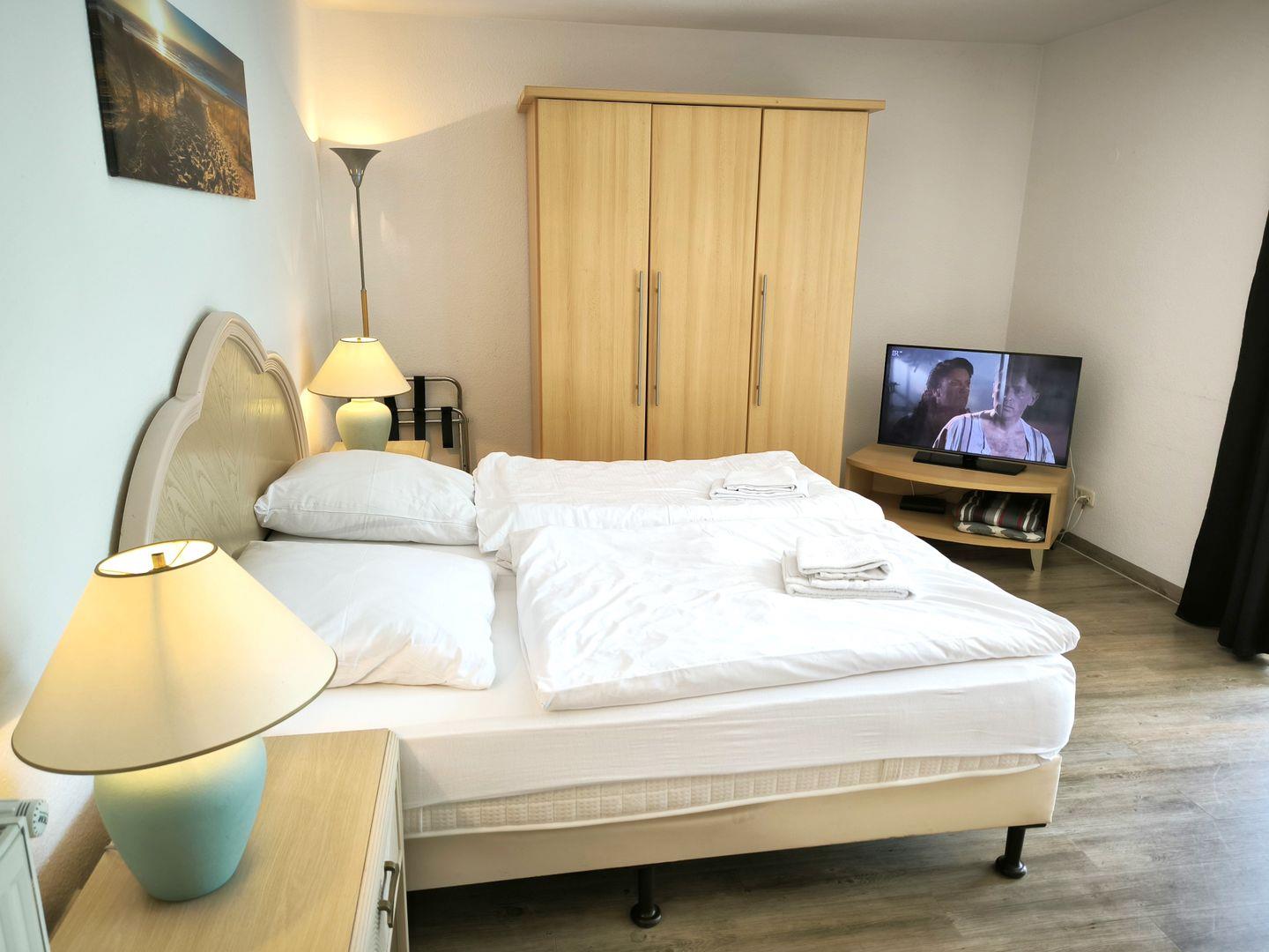 kombinierter Wohn-/Schlafraum mit Doppelbett (180 x 200 cm), Nachttischen, großem Kleiderschrank, Tisch mit 2 Ledersesseln, Anrichte mit TV, Kofferablage